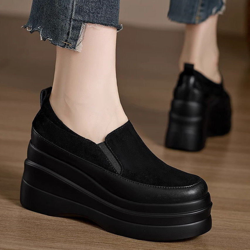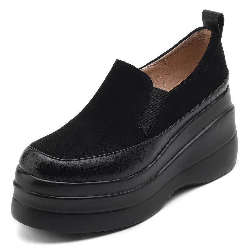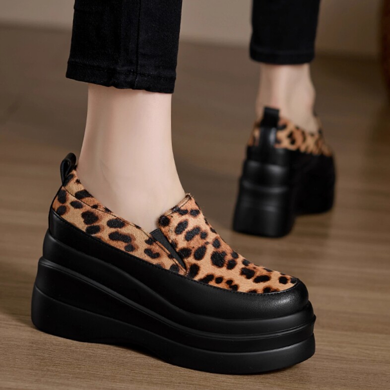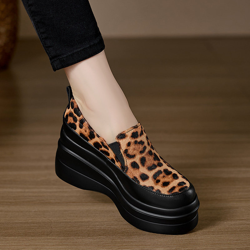 坡跟深口高跟单鞋 松糕底豹纹一脚蹬休闲鞋 新款 头层牛皮2024秋冬季