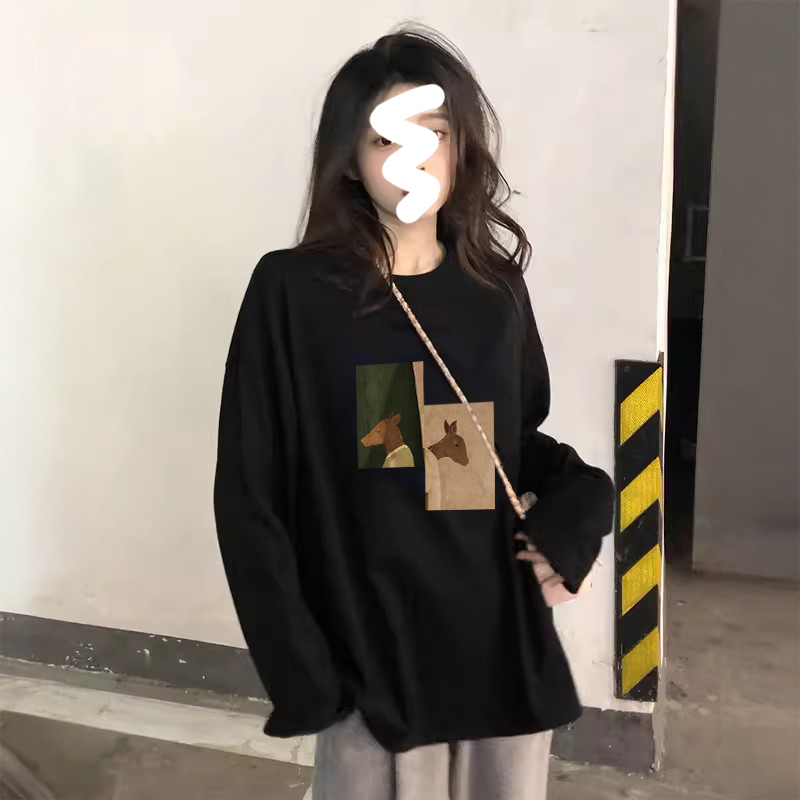 纯棉黑色打底衫 t恤女圆领显瘦宽松印花上衣 女秋冬内搭可外穿长袖