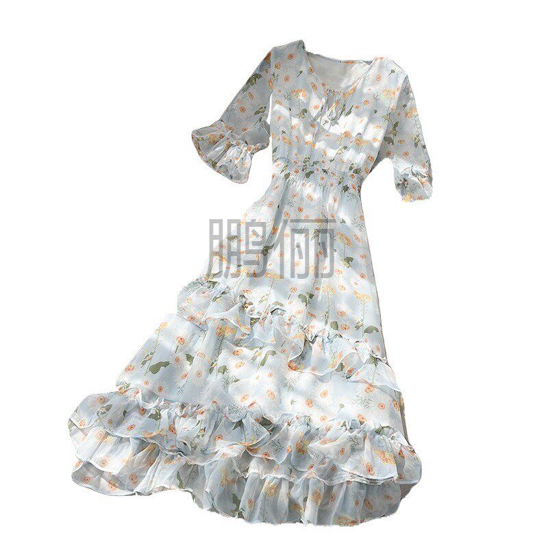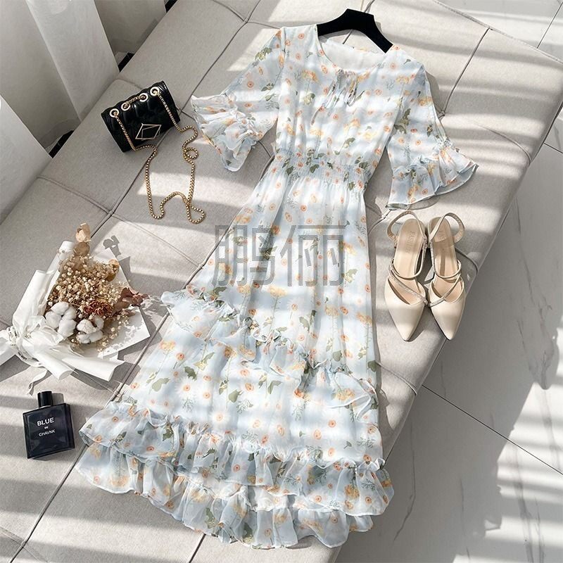 胖mm遮肚显瘦中长雪纺 清新减龄碎花连衣裙女夏季 鹏俪大码 2024新款