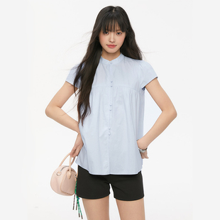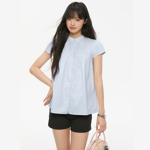 宽松飞袖 Pink 小清新设计感小立领衬衫 夏季 捏褶衬衣女 ers联名款