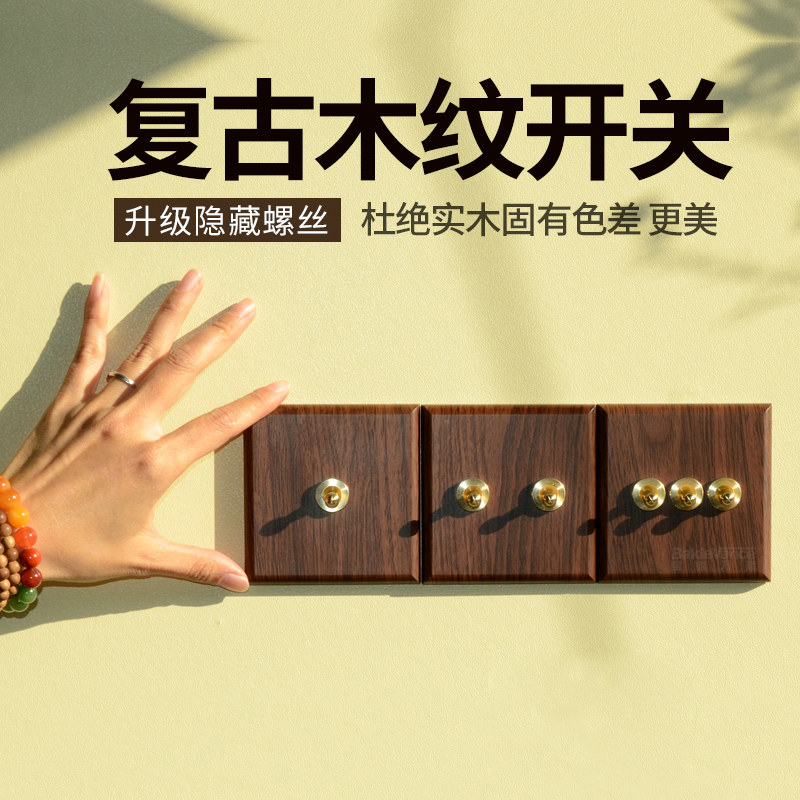 宝德万斯木纹黄铜拨杆仿古中式 创意复古开关86型墙壁五孔插座面板