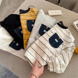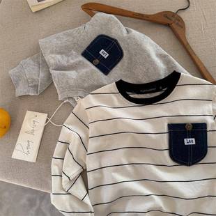 2025春秋儿童长袖 T恤男女童牛仔口袋上衣宝宝洋气潮牌条纹打底衫