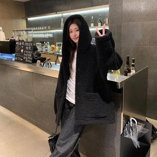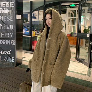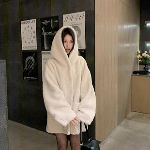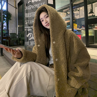 韩系牛角 皮草女冬毛毛外套 100羊羔毛皮毛一体宽松慵懒立领中长款