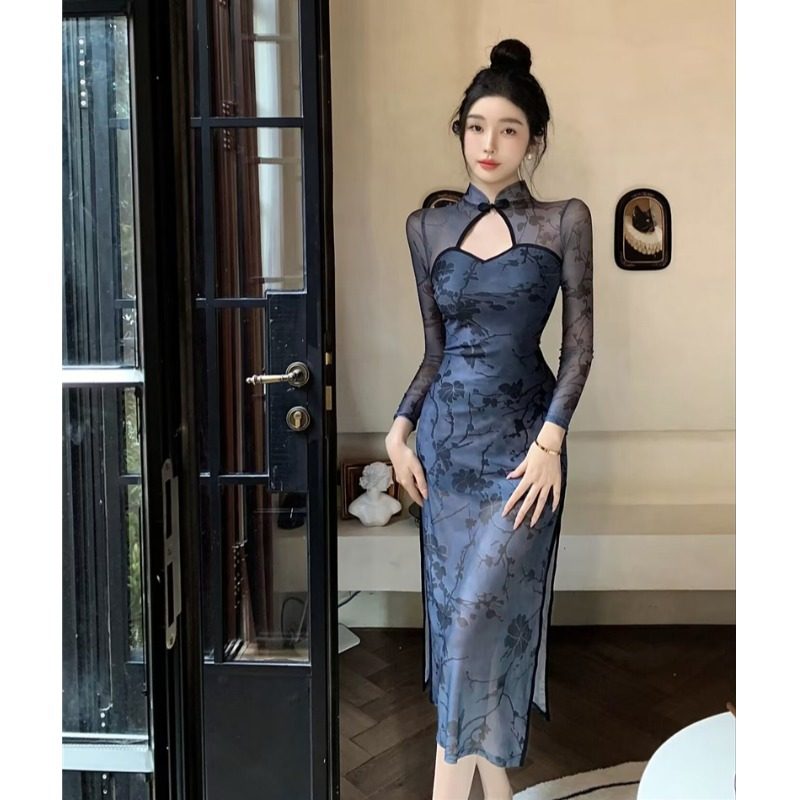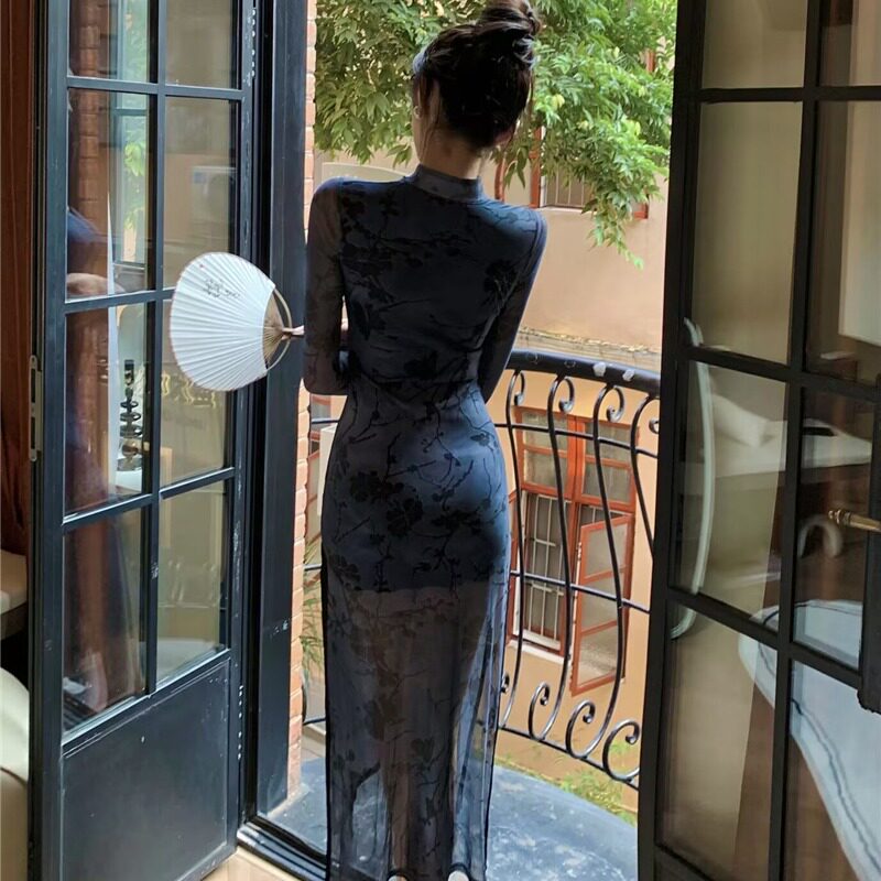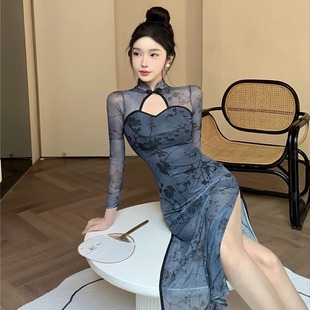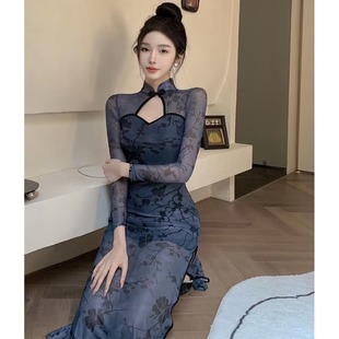 连衣裙女技师服显白性感开叉裙 复古典舞蹈旗袍网纱长袖 秋季 新中式