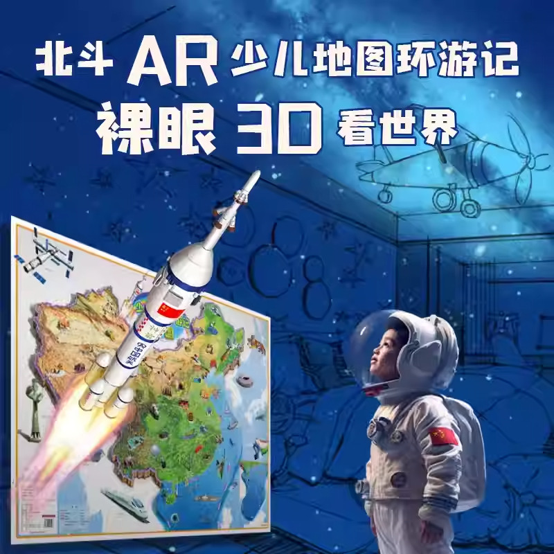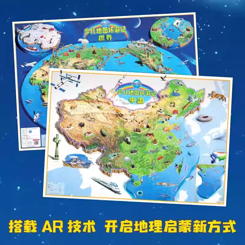 北斗AR少儿地图环游记中国地图和世界地图全2张约1.1 0.8米儿童地理启蒙3D卫星影像地图高清挂画家用墙贴挂图附赠配套APP