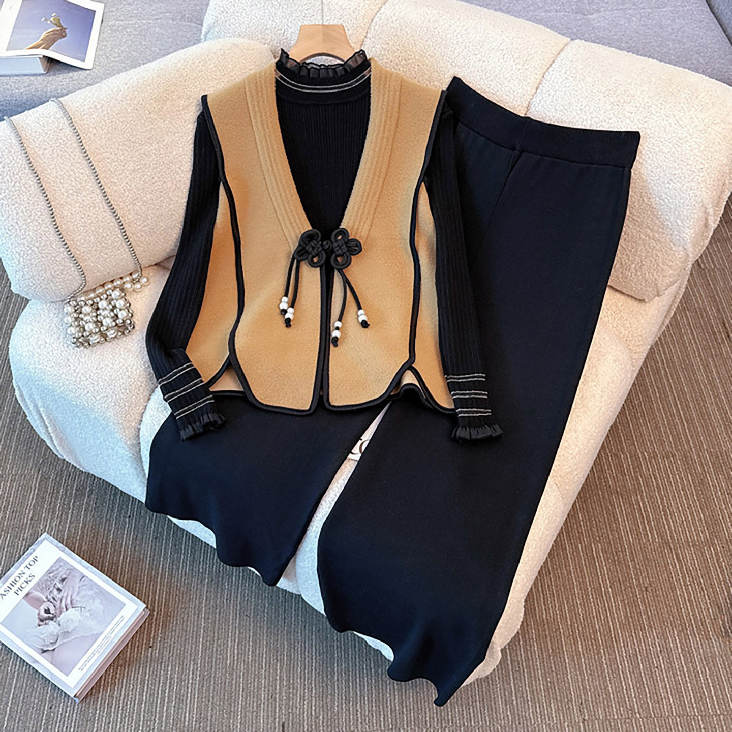 套装 盘扣马甲三件套中年宽松阔腿裤 女 新中式 中老年胖妈妈秋冬新款