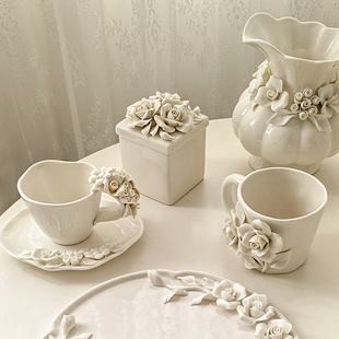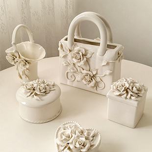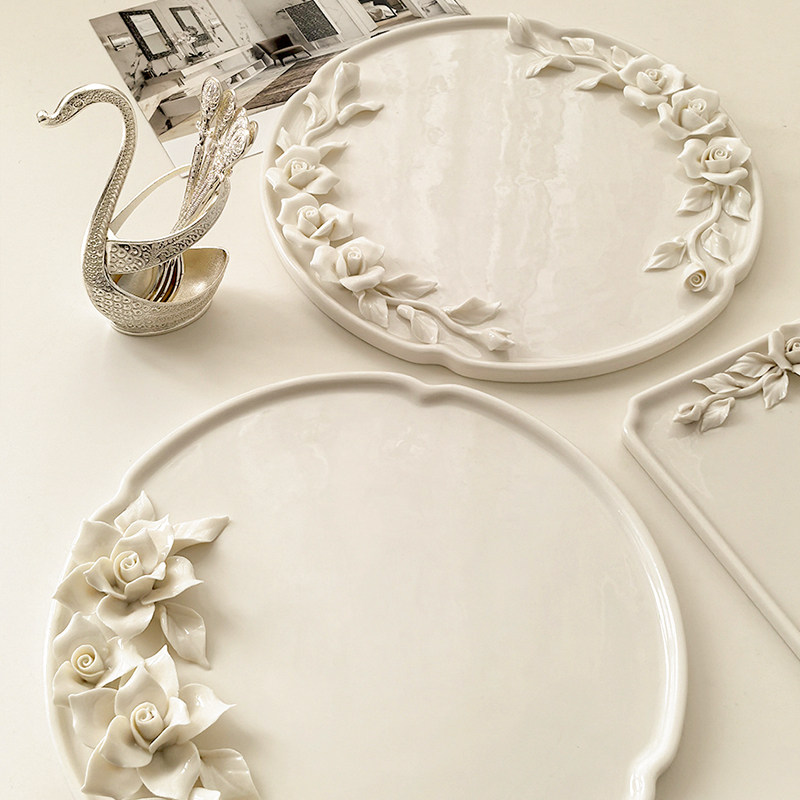 态生活轻奢风浮雕山茶花陶瓷花瓶摆件家用高颜值首饰装 饰罐展示盘