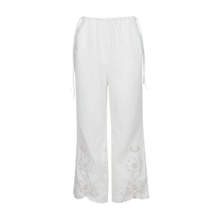 丝麻刺绣白色9分休闲阔腿裤 长腿神裤 法式 时尚 通勤夏季 Bettychow