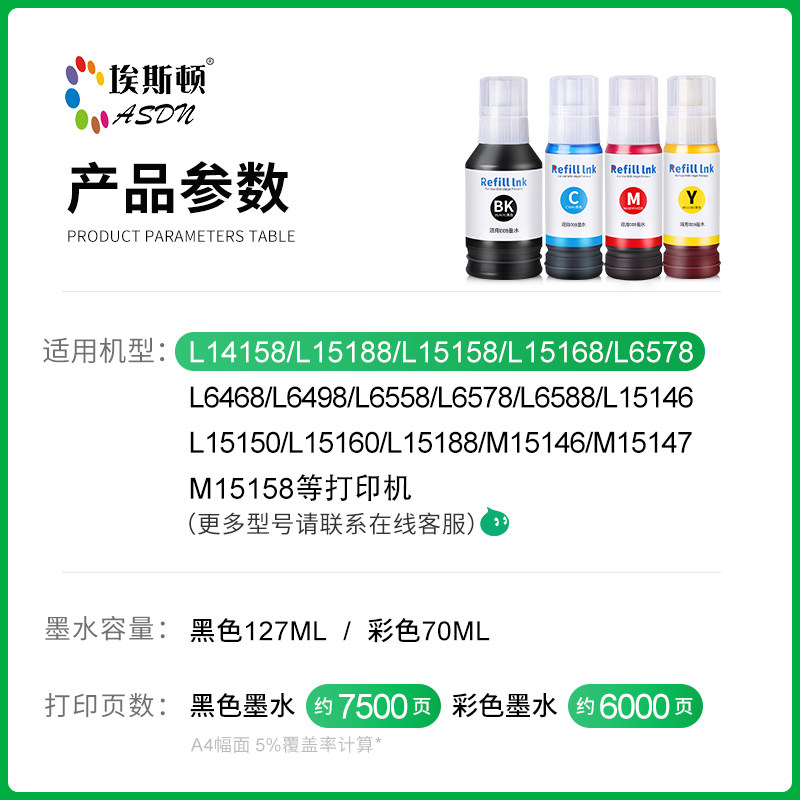 液墨仓式 适用epson爱普生L14158墨水L6578 爱普森009黑彩色补充装 L6498喷墨打印机非原装 专用油墨汁4色 L6468