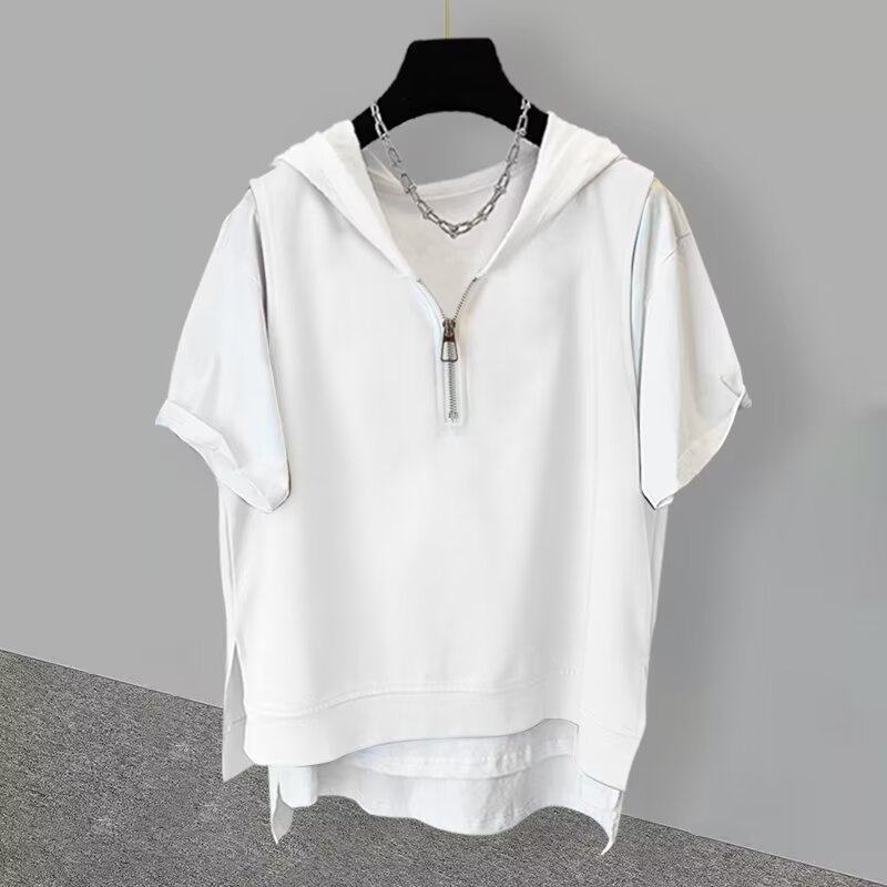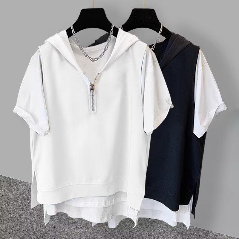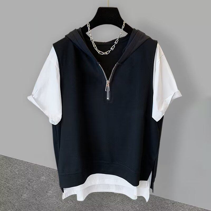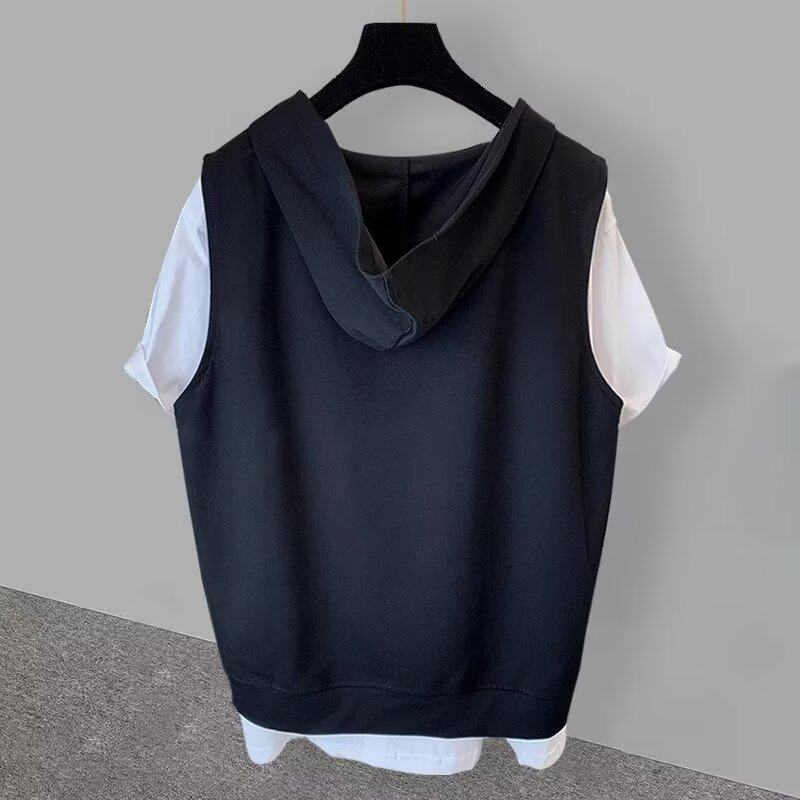 拼接连帽无袖 通勤时尚 新款 夏季 马夹叠穿假两件显瘦别致上衣女 短袖