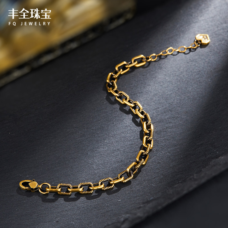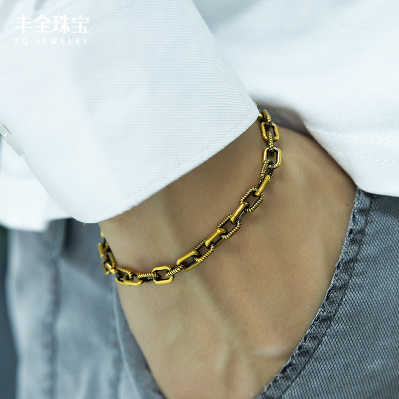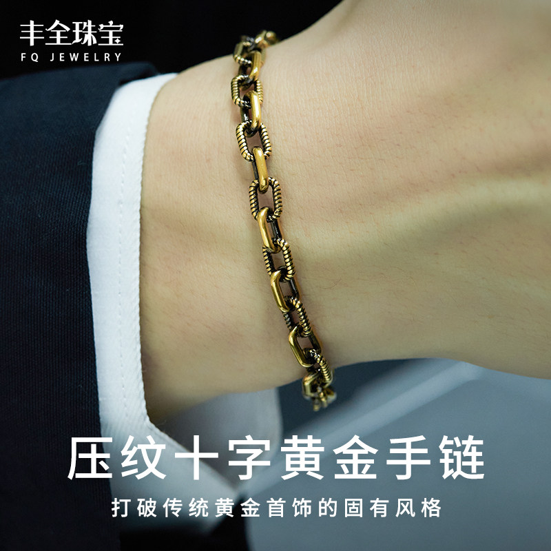 手饰情侣送礼 足金霸气显粗男士 复古黑金压纹十字黄金手链男款 时尚
