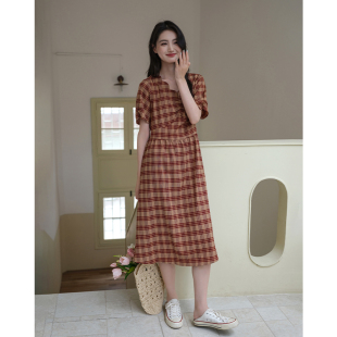 收腰显瘦A字裙 复古别致V领格纹连衣裙胖MM2026夏装 蓝若水大码 女装