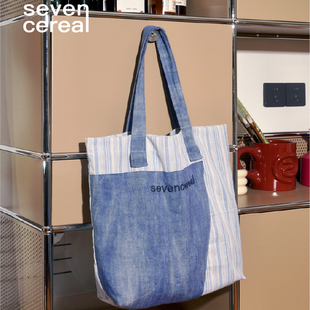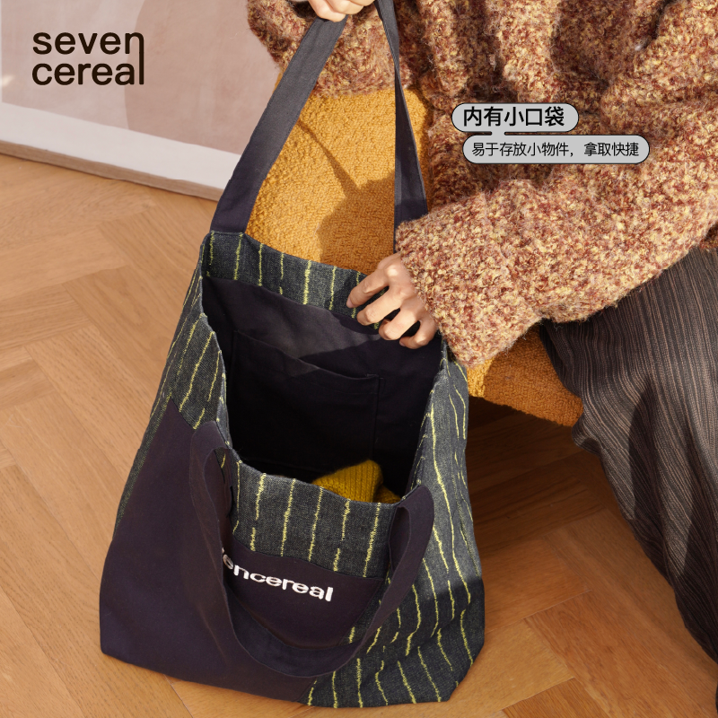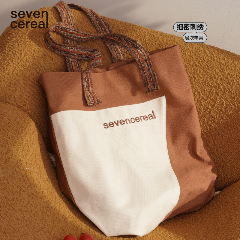 七谷|拼色帆布包手提袋环保购物袋外出拎包大容量上课上班单肩包