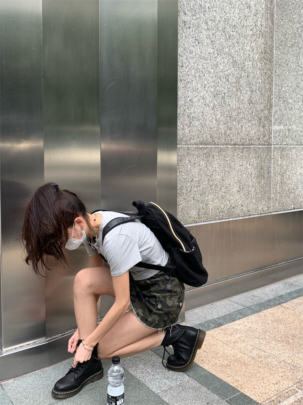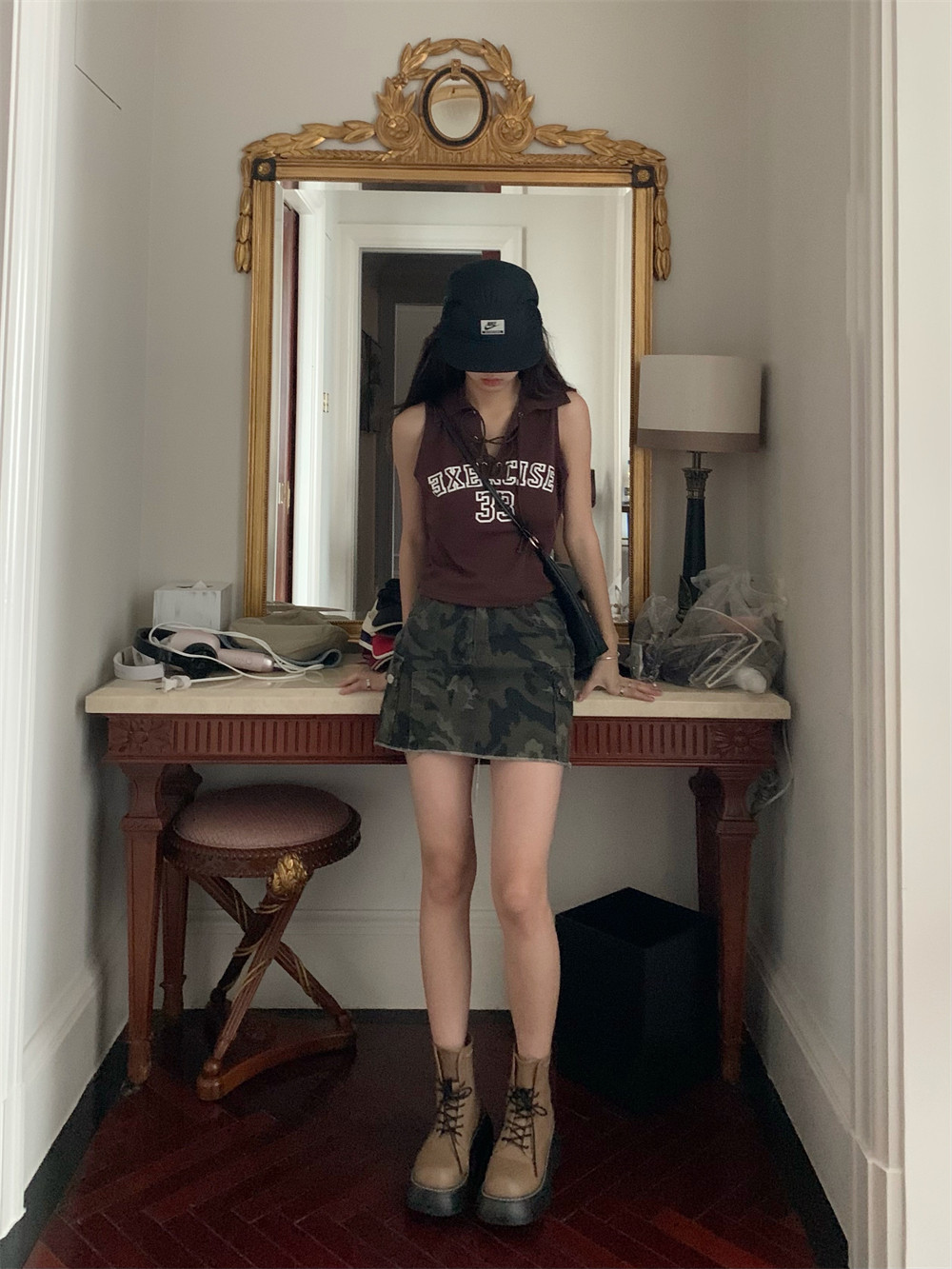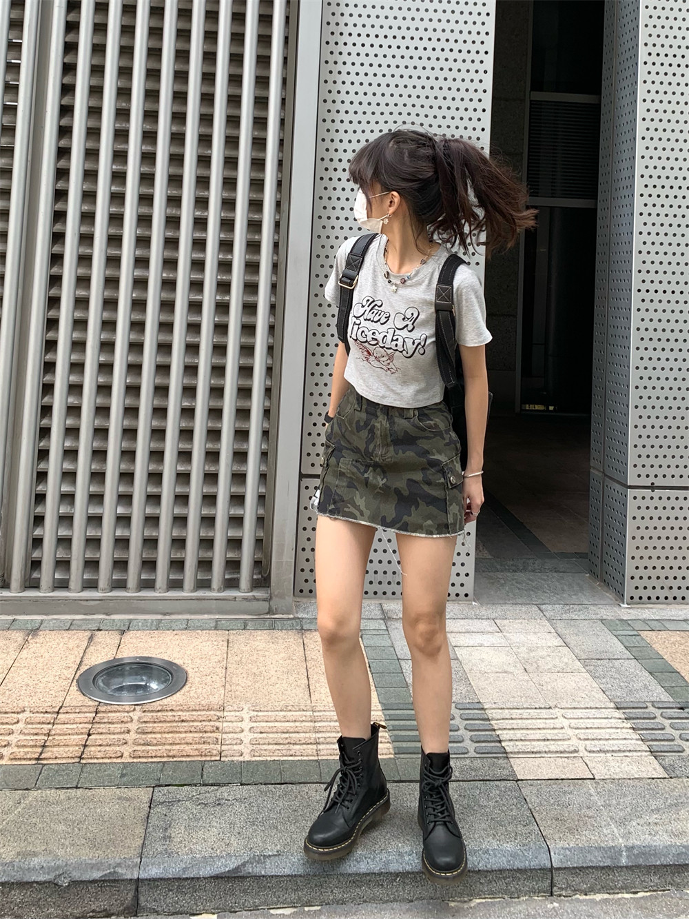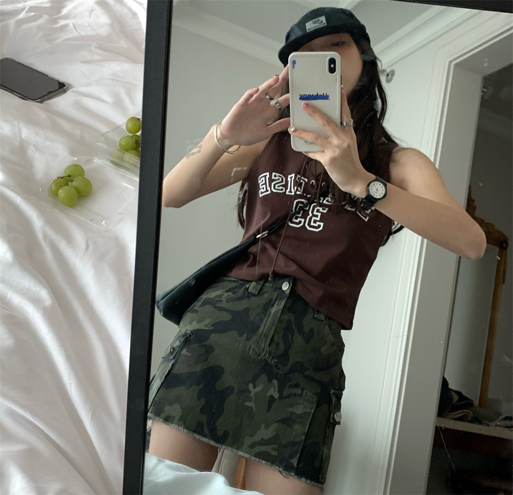 高腰修身 韩版 半身裙女潮 复古设计毛边迷彩A字短裙2025夏季 荒荒家