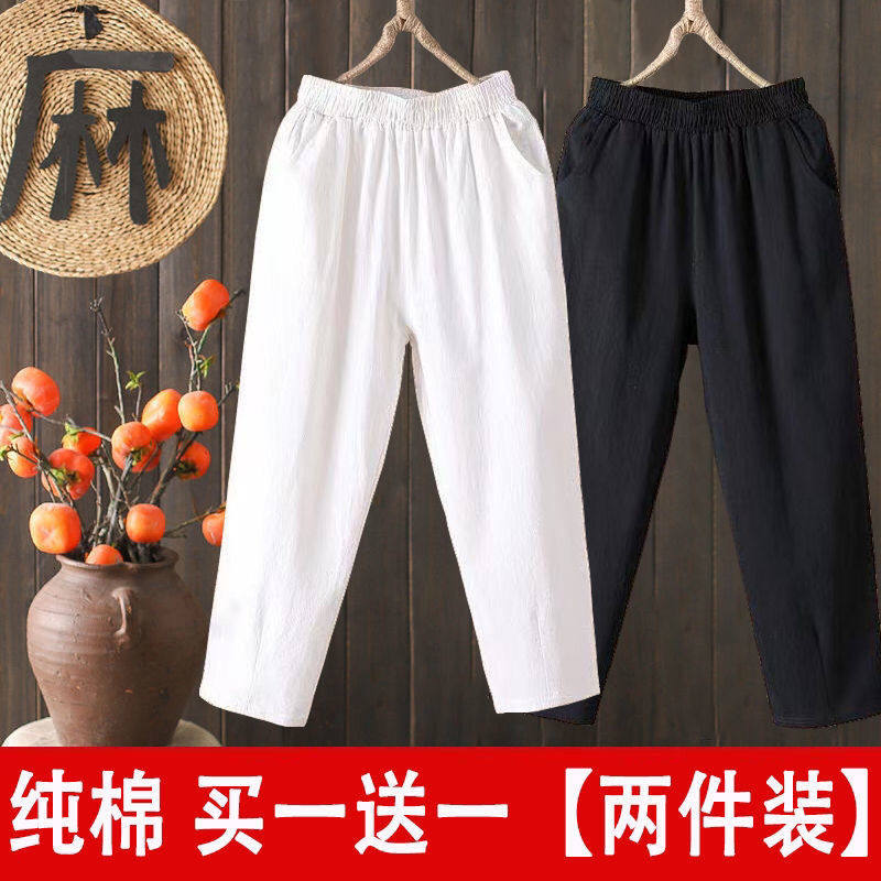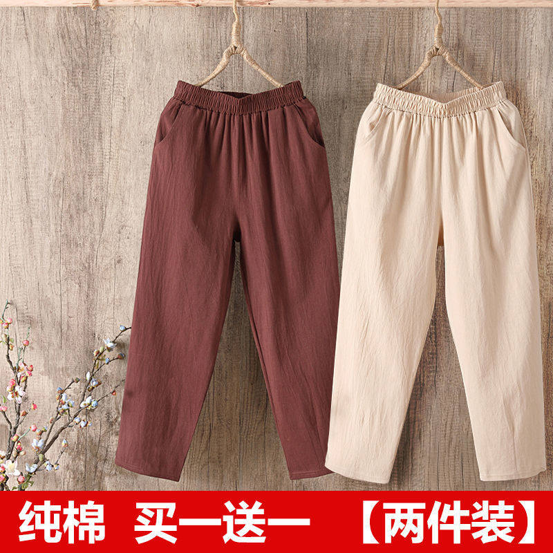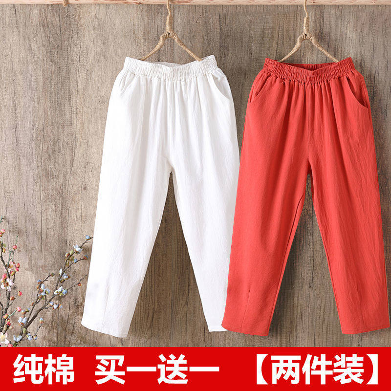 女夏季 纯棉哈伦裤 宽松百搭大码 棉麻九分裤 子 单 女士休闲裤 两件装