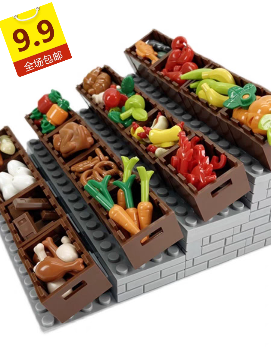 热狗小颗粒积木场景散件 萝卜苹果 MOC人仔手持食物水果面包 香蕉
