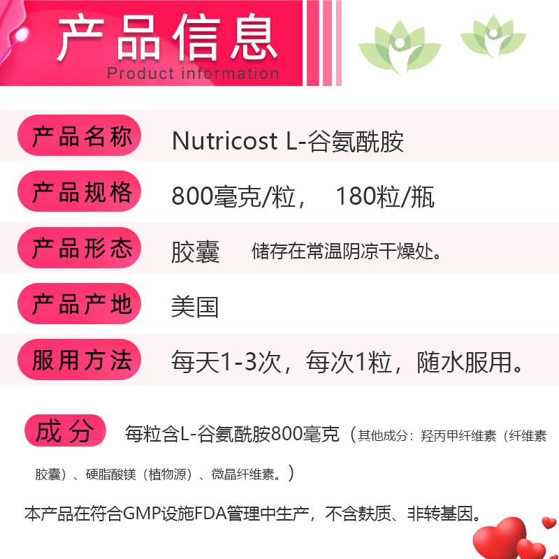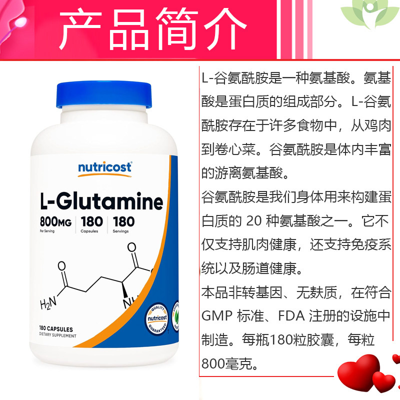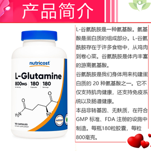 Glutamine肠道 180粒L 美国 Nutricost谷氨酰胺800毫克