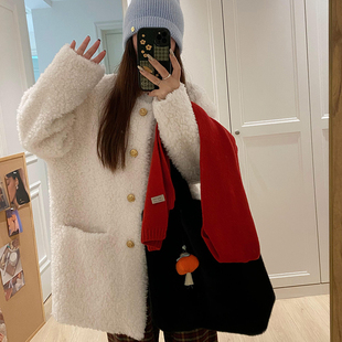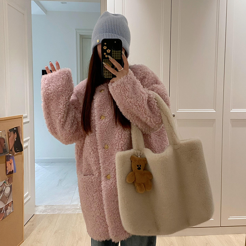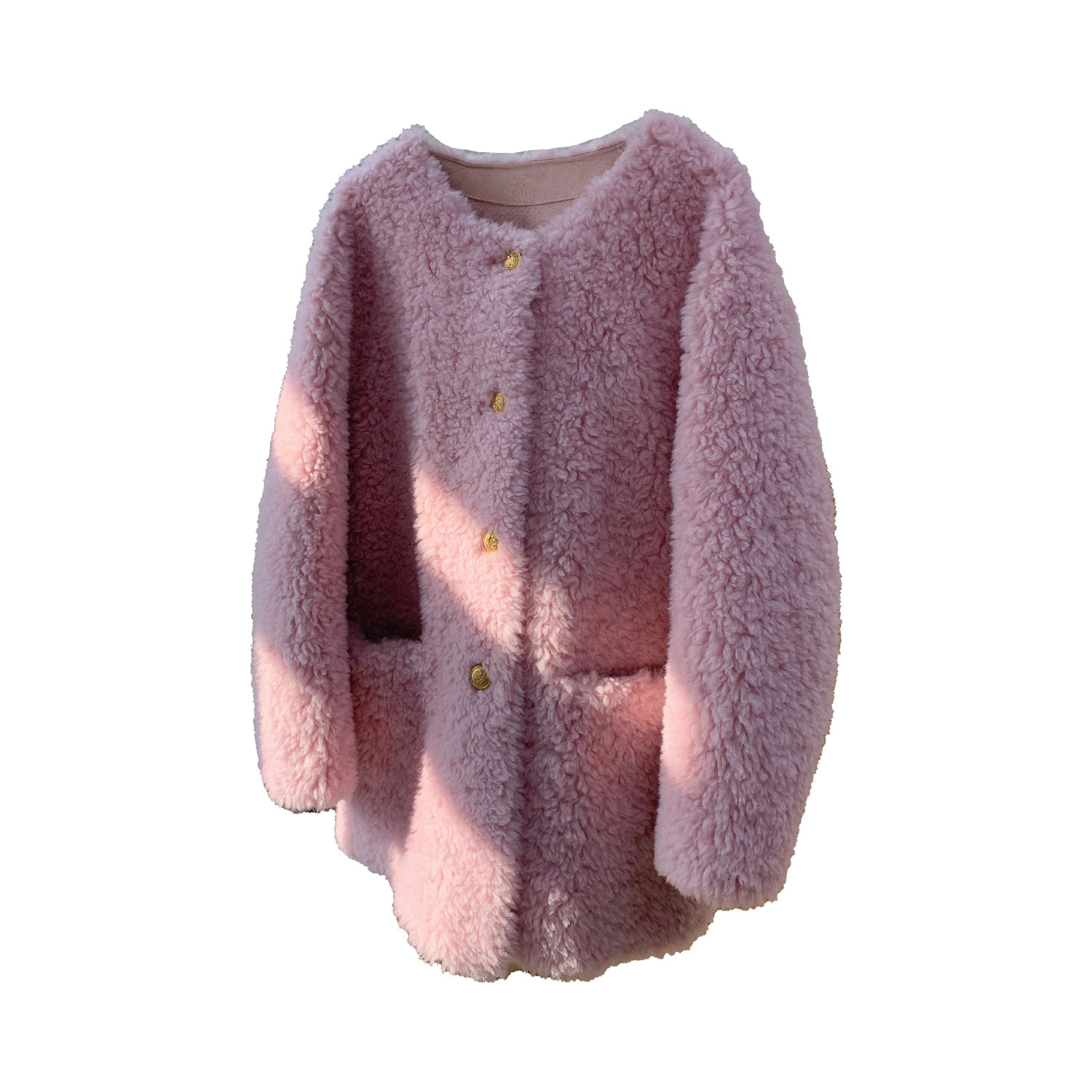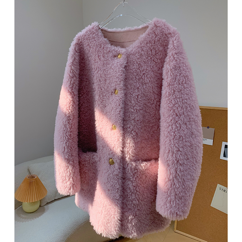 绵密柔软羊羔毛皮毛一体纯羊毛圆领金扣韩版 皮草女冬毛毛外套粉色
