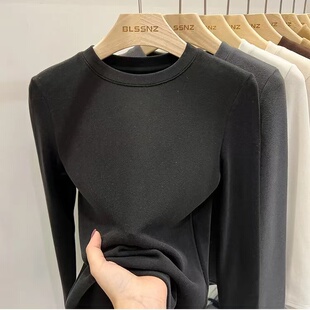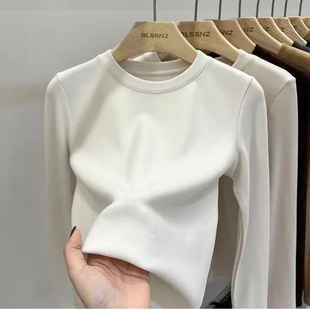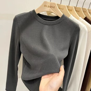 圆领双面德绒打底衫 t恤女潮 女秋冬内搭加绒宽松保暖上衣纯色长袖