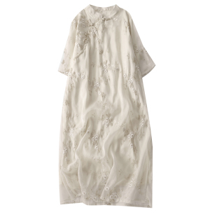 新中式 气质改良旗袍裙超仙气质长裙 重工刺绣盘扣苎麻连衣裙女夏季