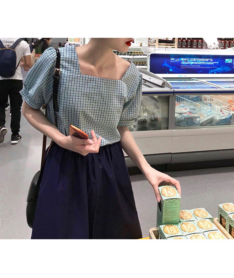 特价 衬衣褶皱短袖 清仓 新上衣韩版 T恤 原创复古格子夏季 洛边