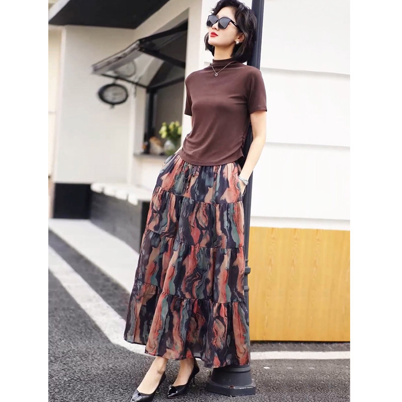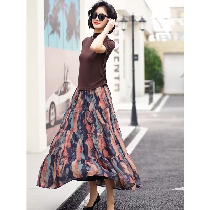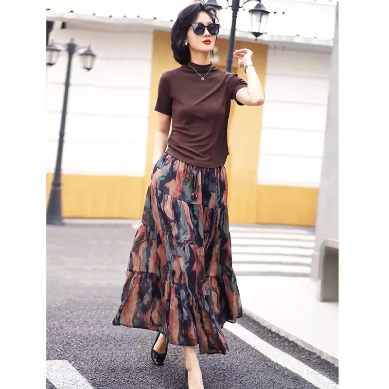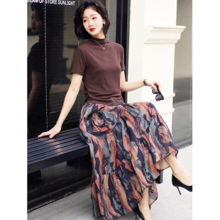 新款 裙妈妈气质2026夏季 咖色显瘦上衣遮肉半身裙 绝美套装 胖mm大码