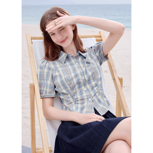 百搭泡泡袖 betu百图蓝色格子衬衫 新款 2025年夏季 掐腰衬衣 女短袖