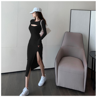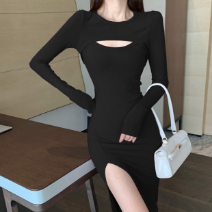 显瘦性感包臀过膝黑色长裙女 高开叉连衣裙设计感小众修身 新款 大码