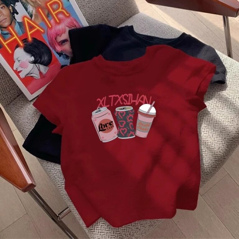 洋气减龄韩系小众修身 夏季 显瘦上衣ins t恤女2025新款 正肩印花短袖