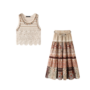 波西米亚镂空钩花背心印花半身裙套装 Chapelle夏季 女 拉夏贝尔