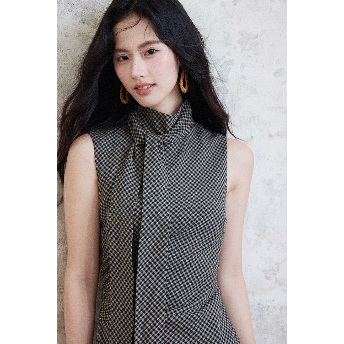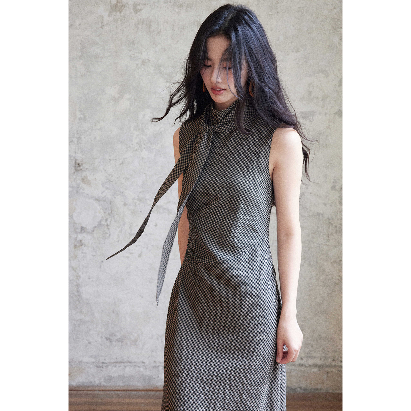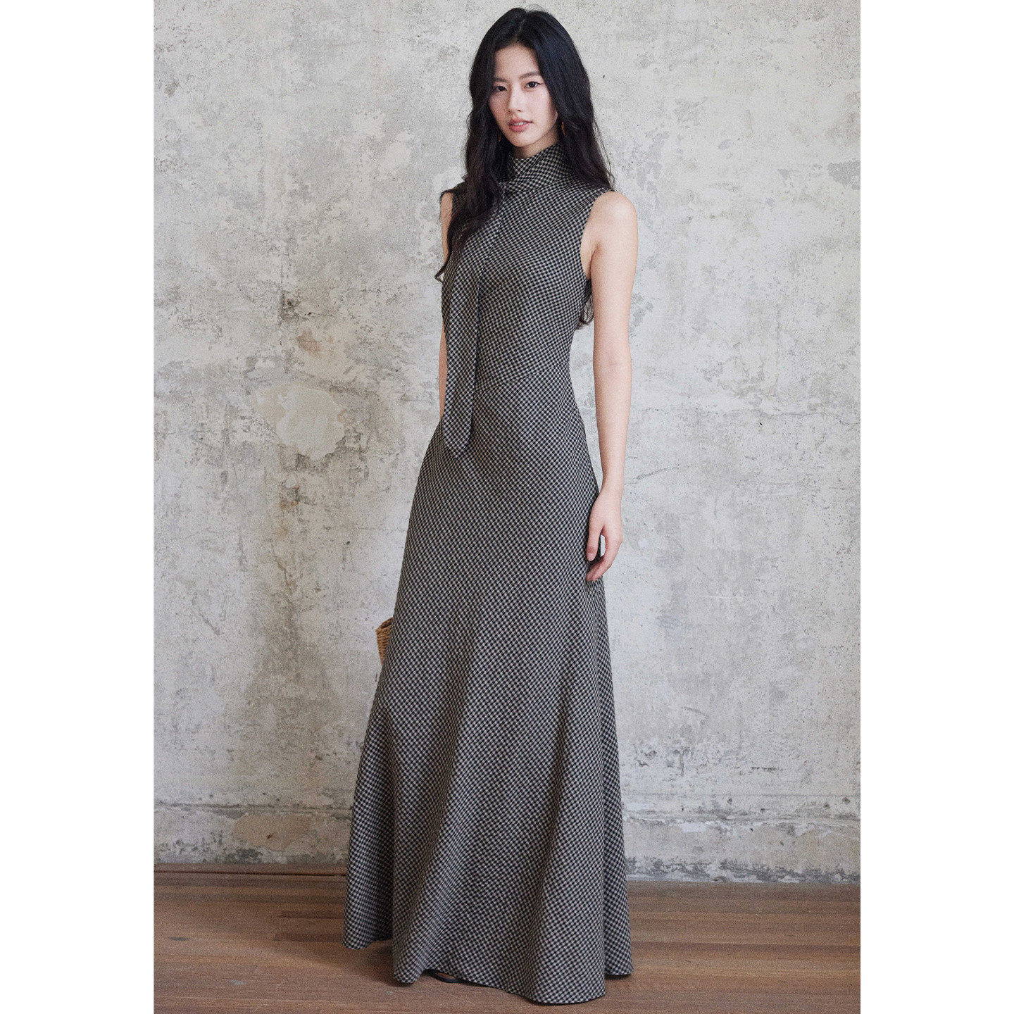纯棉斜裁长裙 复古几何纹鱼尾连衣裙女飘带领修身 贰羊设计 凌波