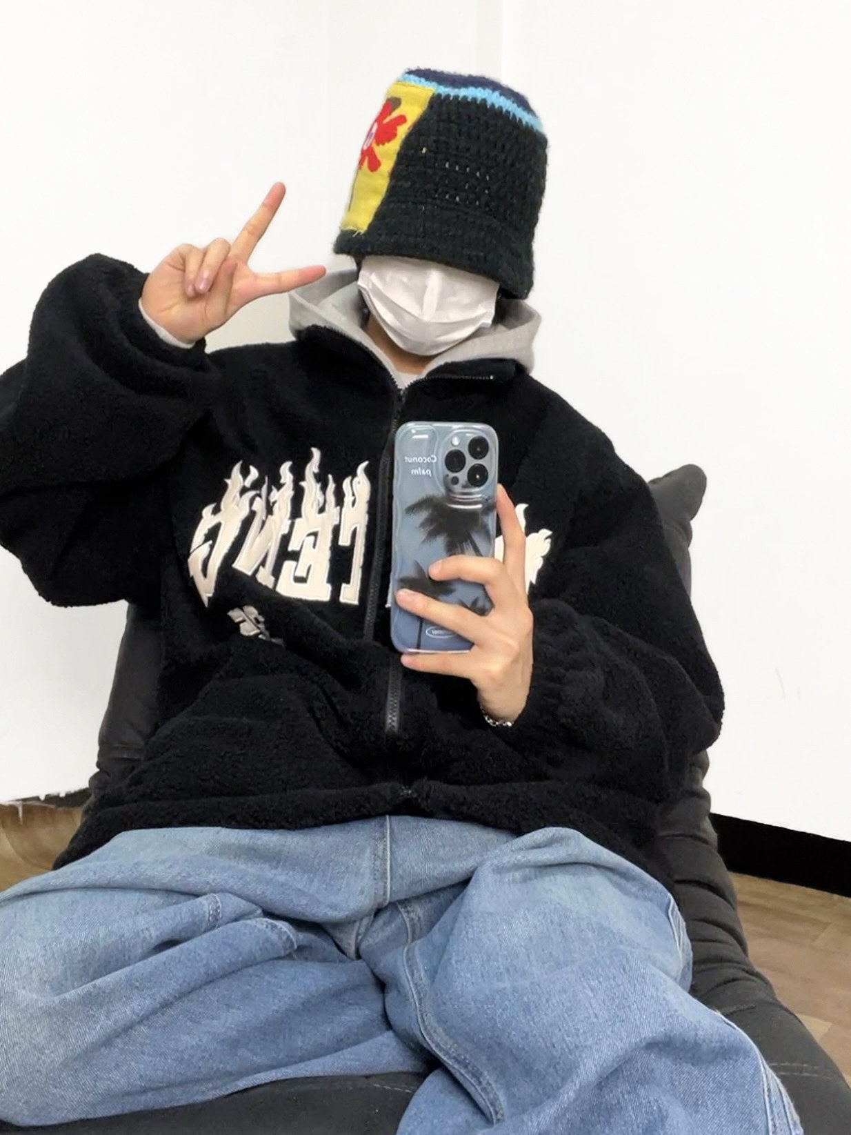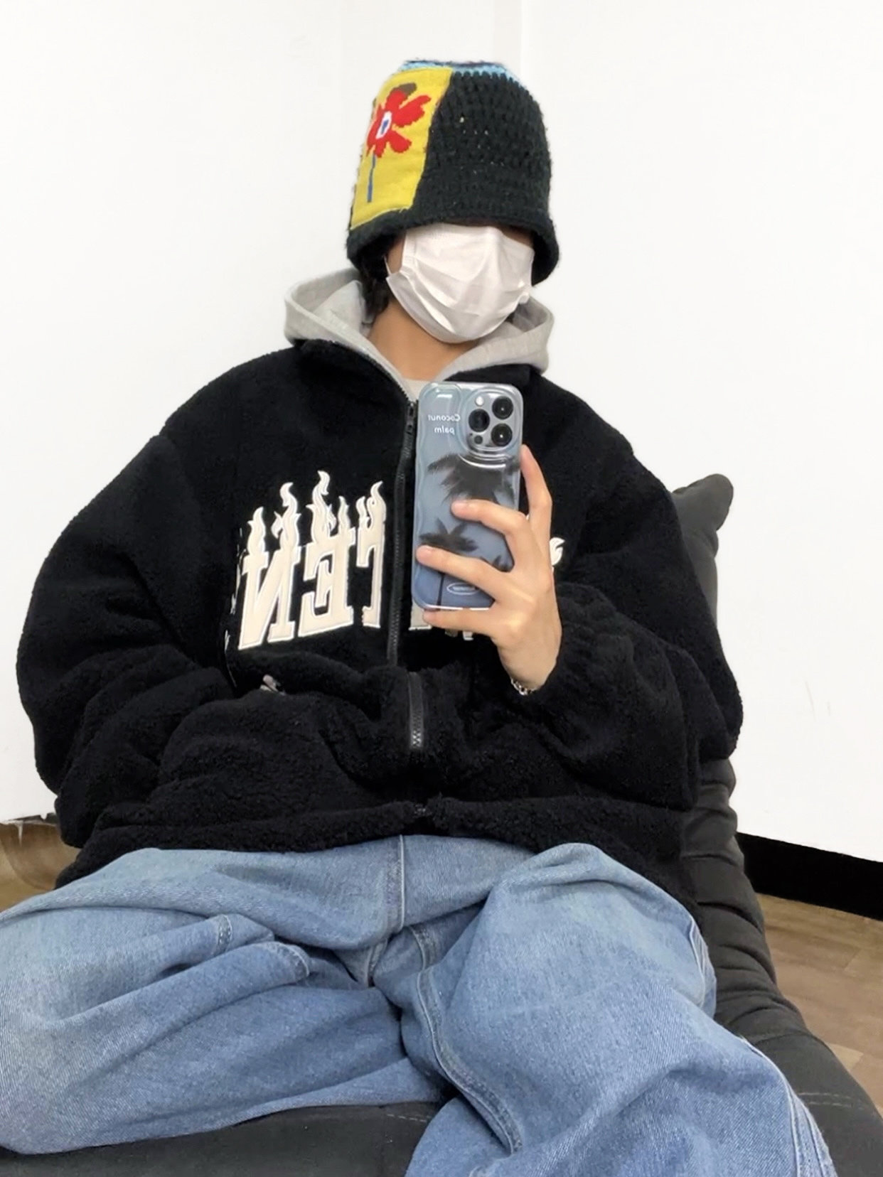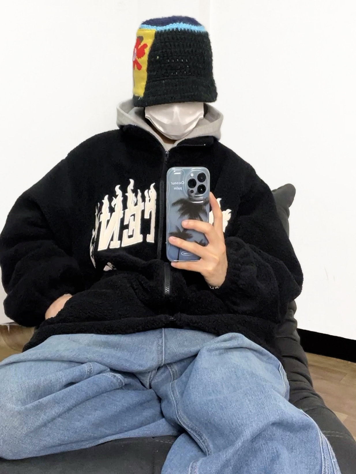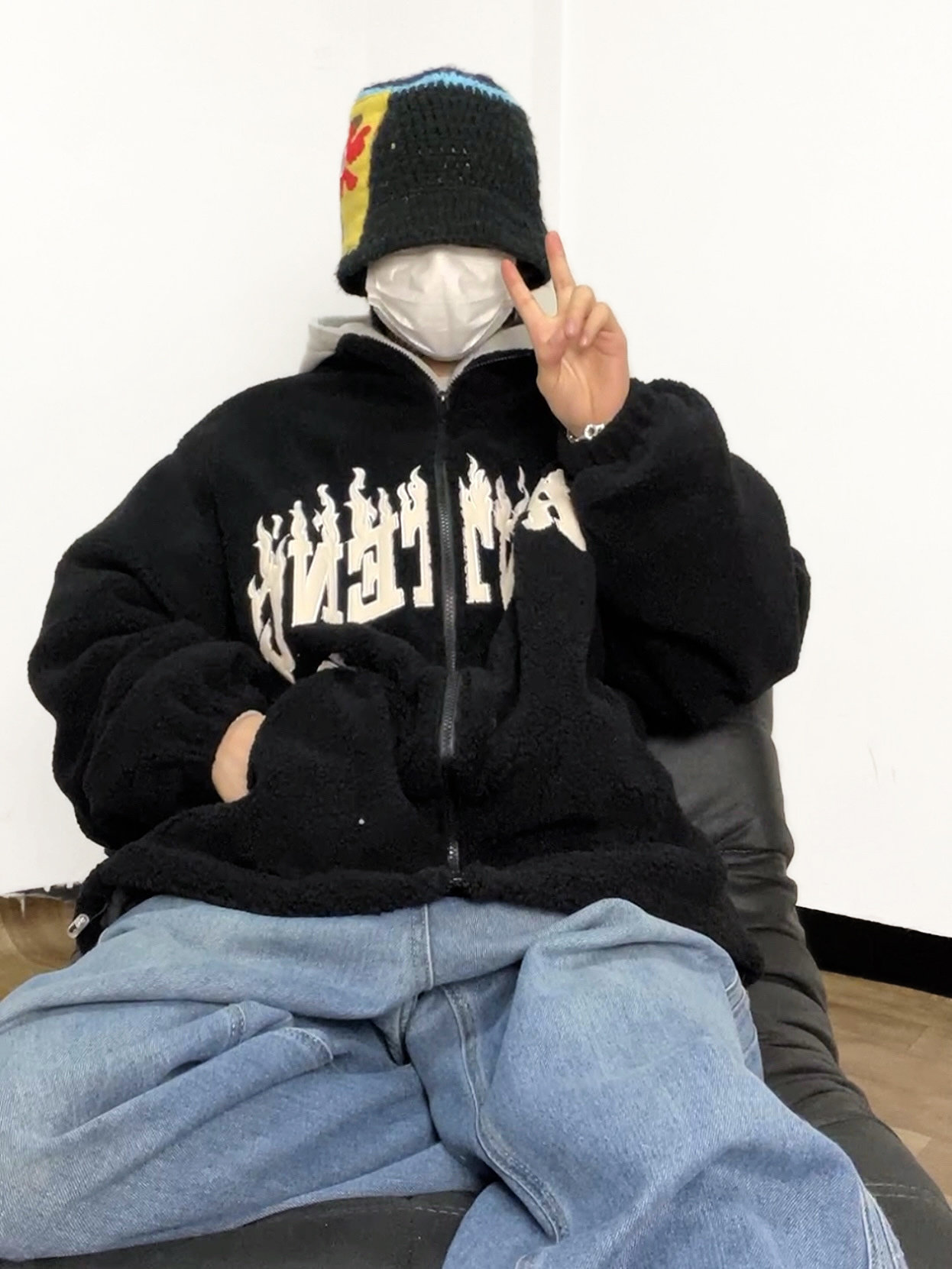F383 2022AW国潮原创火焰字母立领羊羔毛棉服男女宽松加厚外套ins