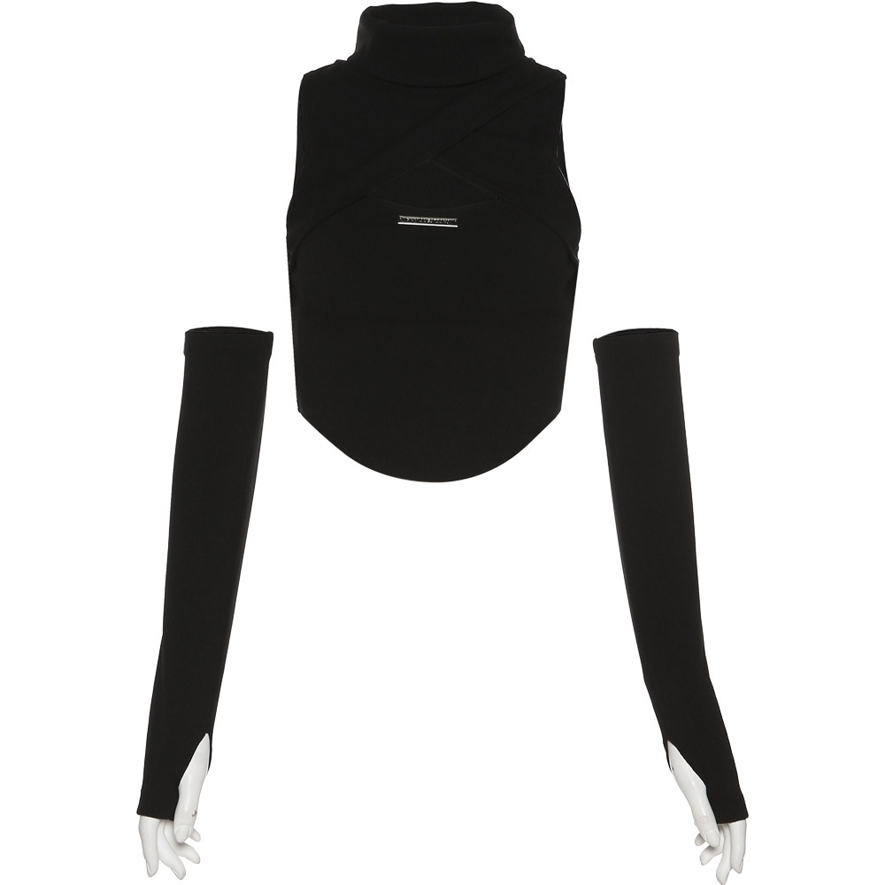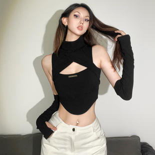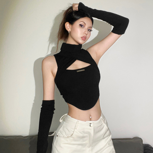 显瘦带袖 黑色镂空半高领不规则背心女修身 套上衣潮 酷酷风格 KLIOU