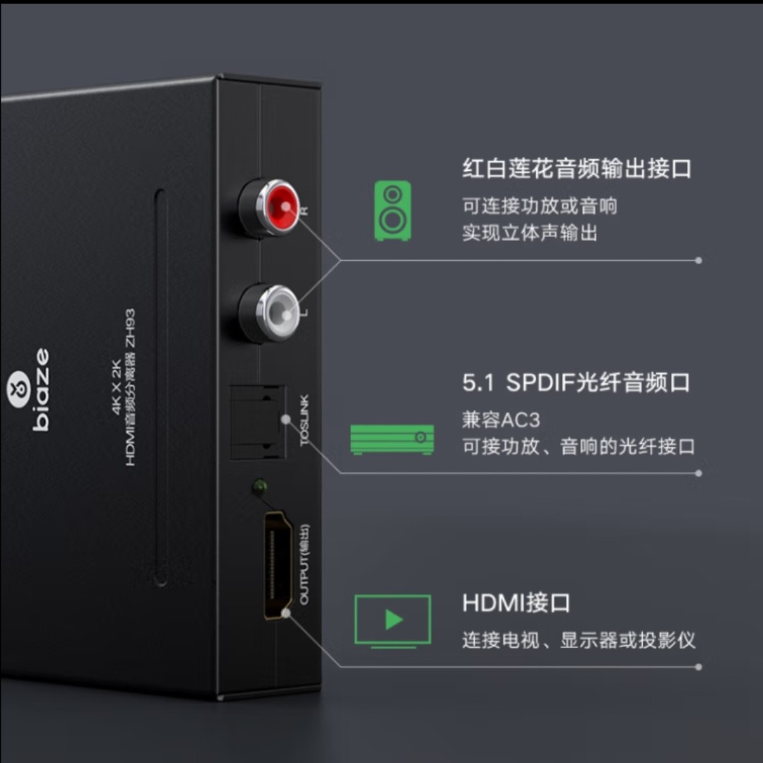 RCA HDMI转HDMI4K光纤音频转换器5.1声道 毕亚兹 HDMI音频分离器