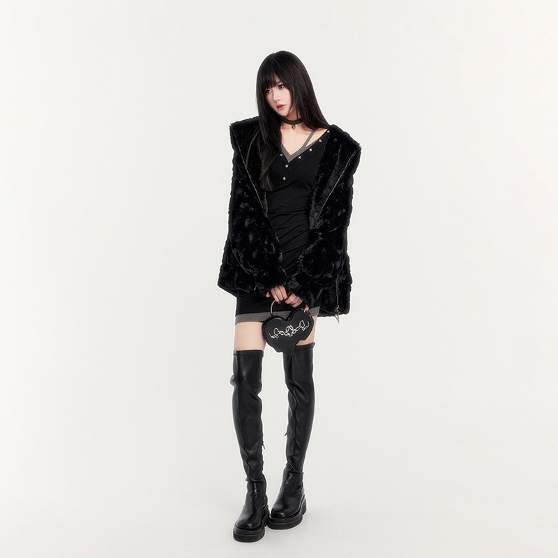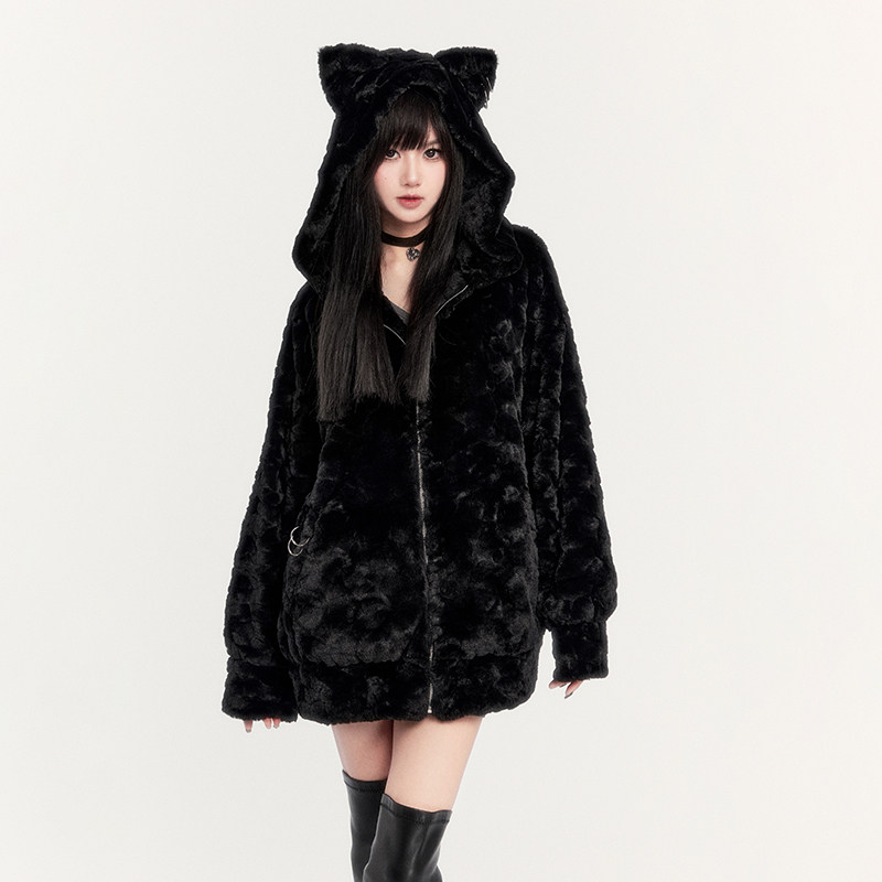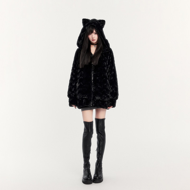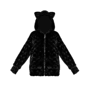 VOCK 暗黑环保皮草情侣猫耳连帽宽松卫衣外套重磅保暖冬 黑猫派对