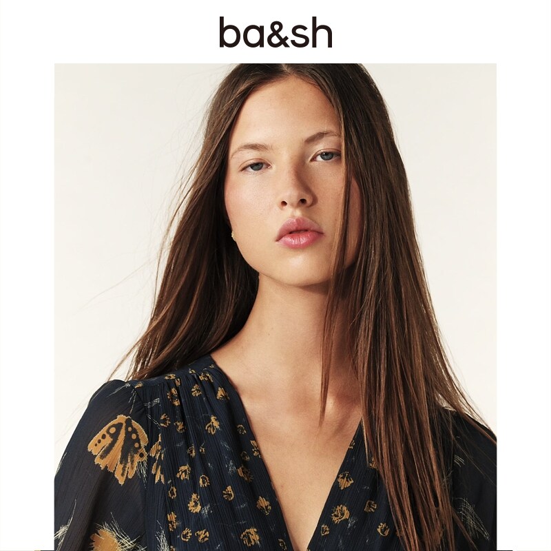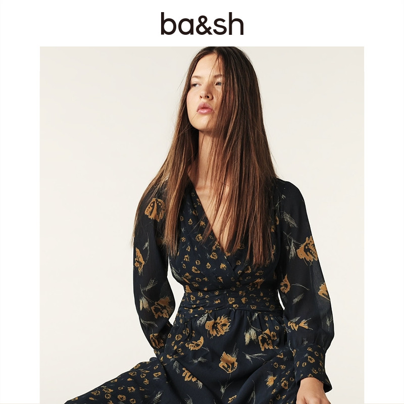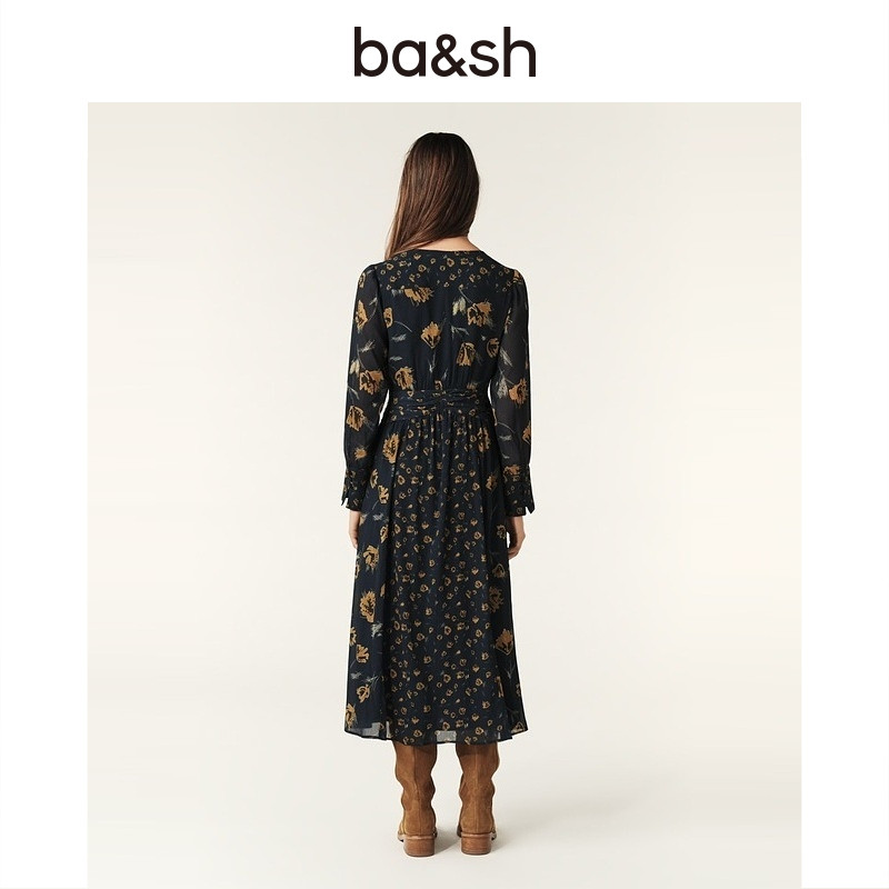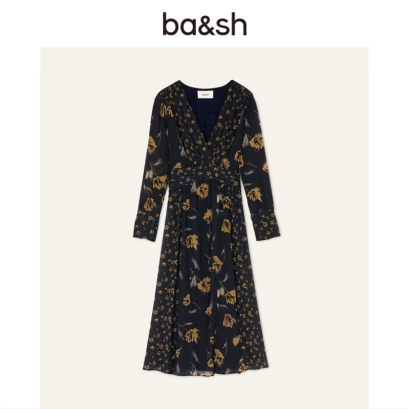 bash春季 复古蒲公英印花V领中长裙子女士显瘦连衣裙1H24FINA 法式