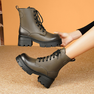 粗跟加绒马丁靴厚底短靴羊毛高跟大棉女鞋 靴子女2025新款 真皮冬季