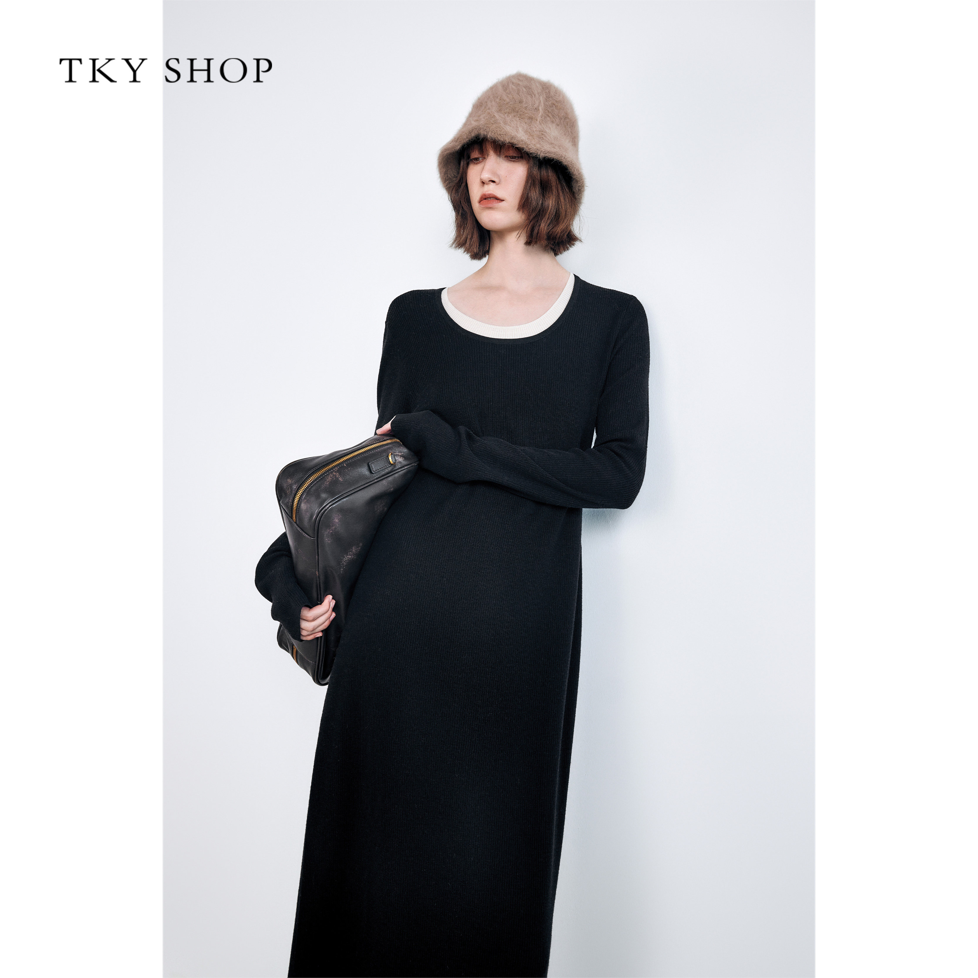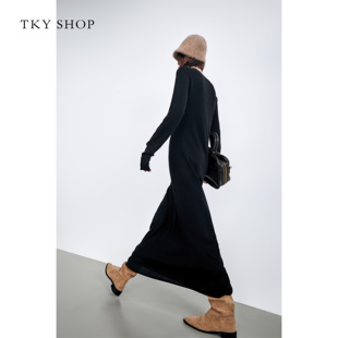 DPLAY2025年冬季 黑色连衣裙女下摆开叉气质毛衣裙针织裙短裙 新款
