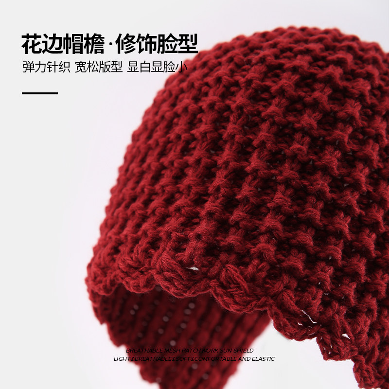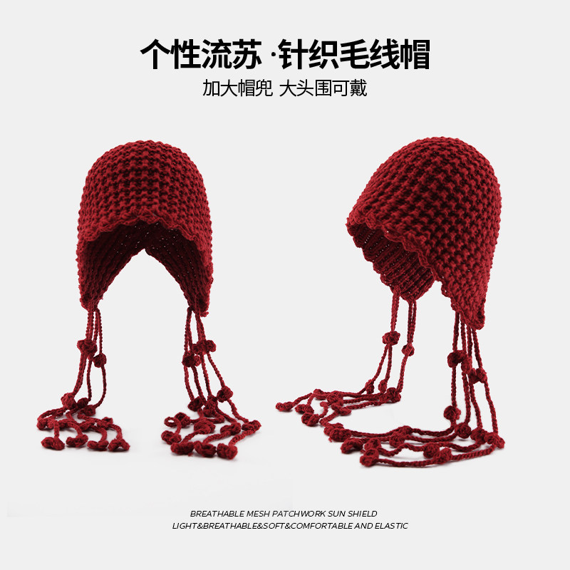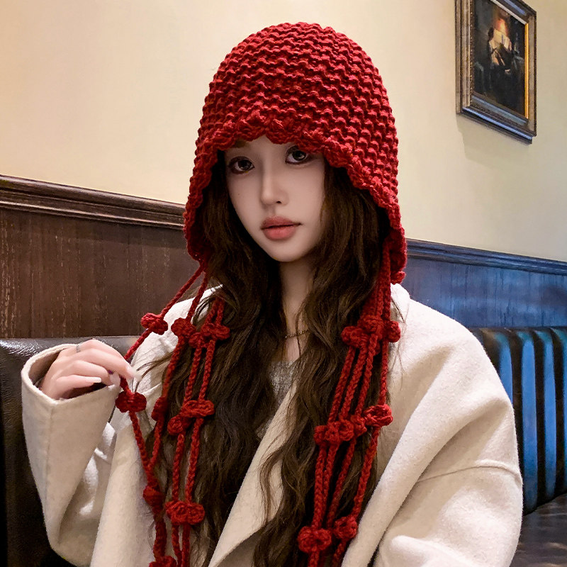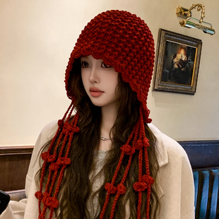 日系网红流苏红色毛线帽子女秋冬韩版 甜美可爱护耳保暖包头针织帽