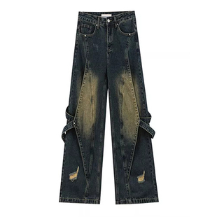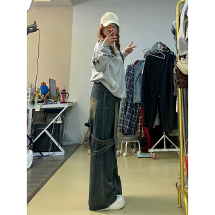 女春秋新款 设计感牛仔裤 高街裤 子显瘦美式 胖mm大码 复古阔腿裤 女装