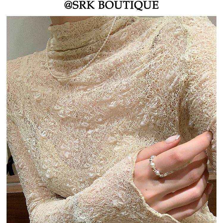 长袖 2024法式 透视性感网纱洋气修身 薄款 小上衣 提花半高领蕾丝衫