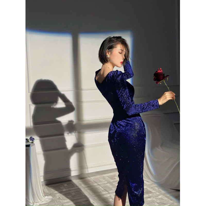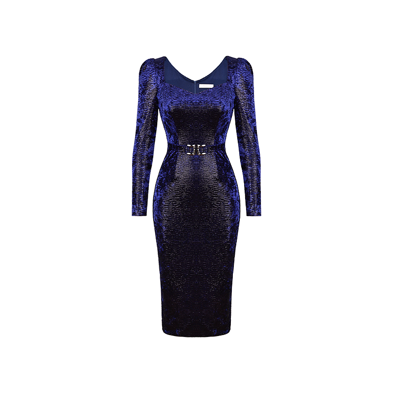 XULU原创欧洲高定雪花丝绒压皱气质通勤优雅小众桃心领长袖 连衣裙