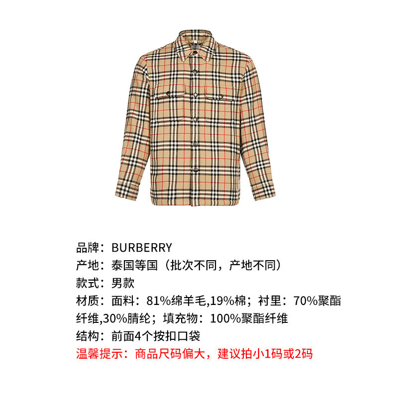 棉服男装 式 外套80438391 绵羊毛衬衫 BURBERRY博柏利男士