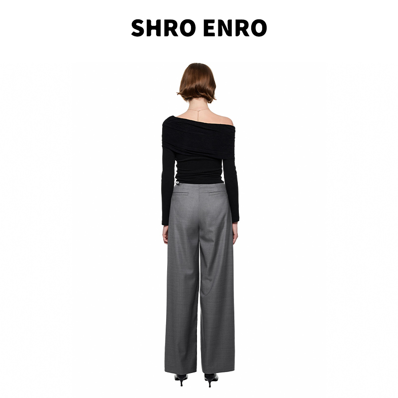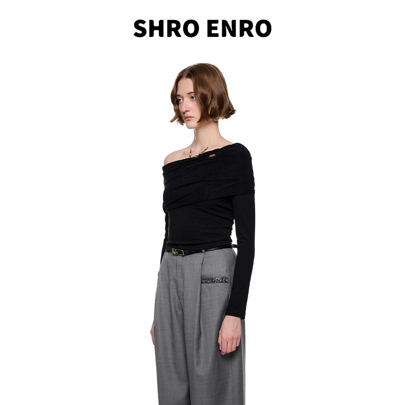 收腰斜肩褶皱一字领度假风针织衫 新款 女士上衣 ENRO2025秋季 SHRO
