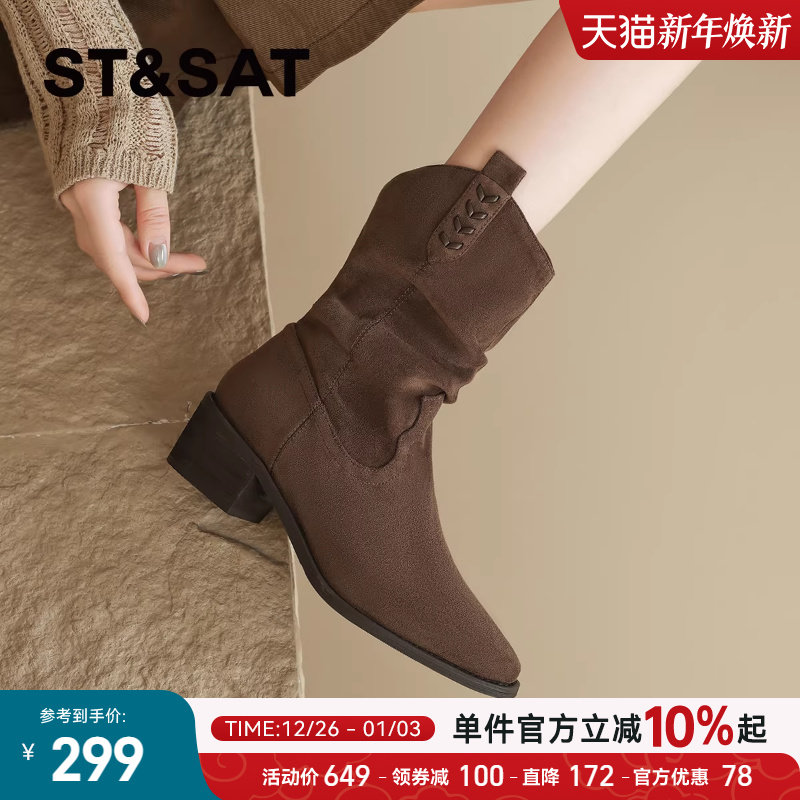 星期六秋冬女靴英伦马丁靴女靴圆头时尚 靴 中跟短筒短靴子复古时装