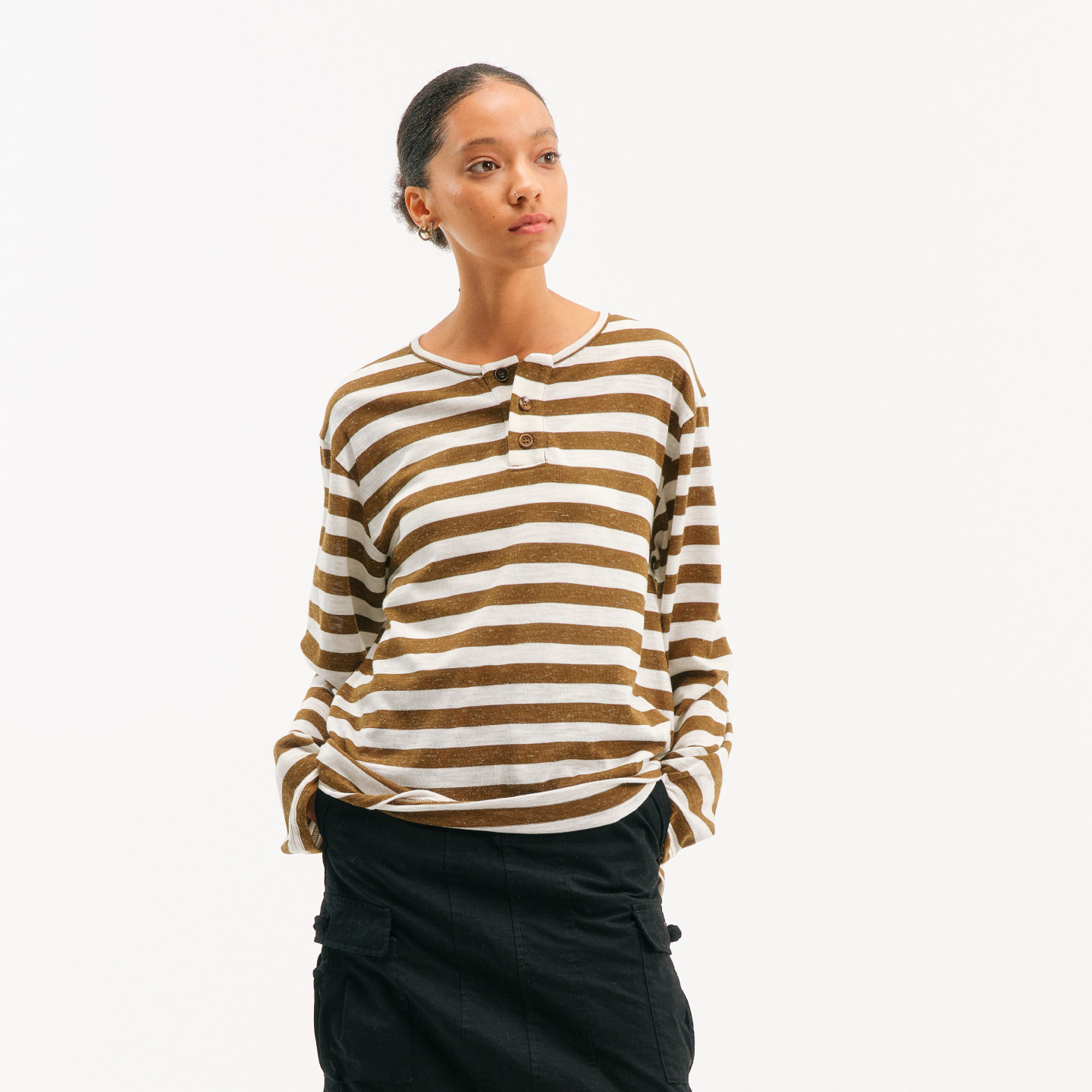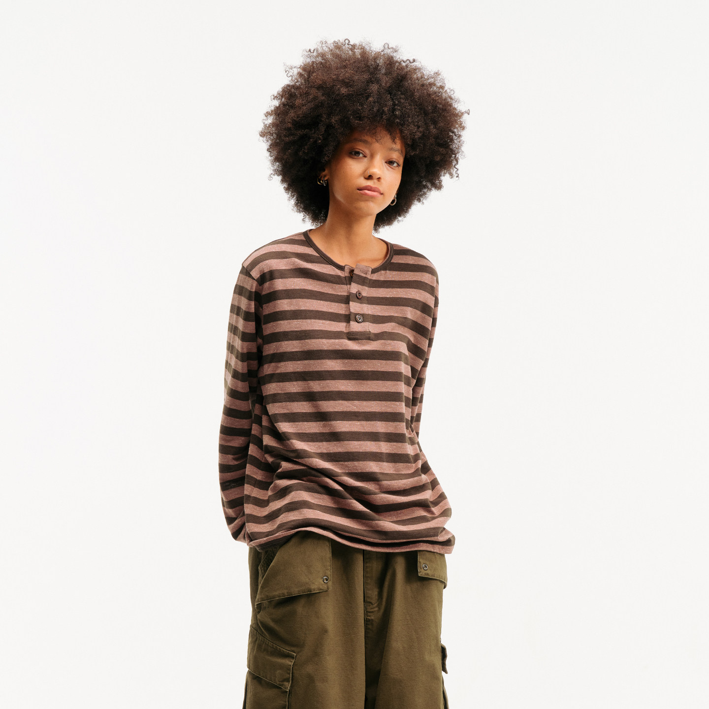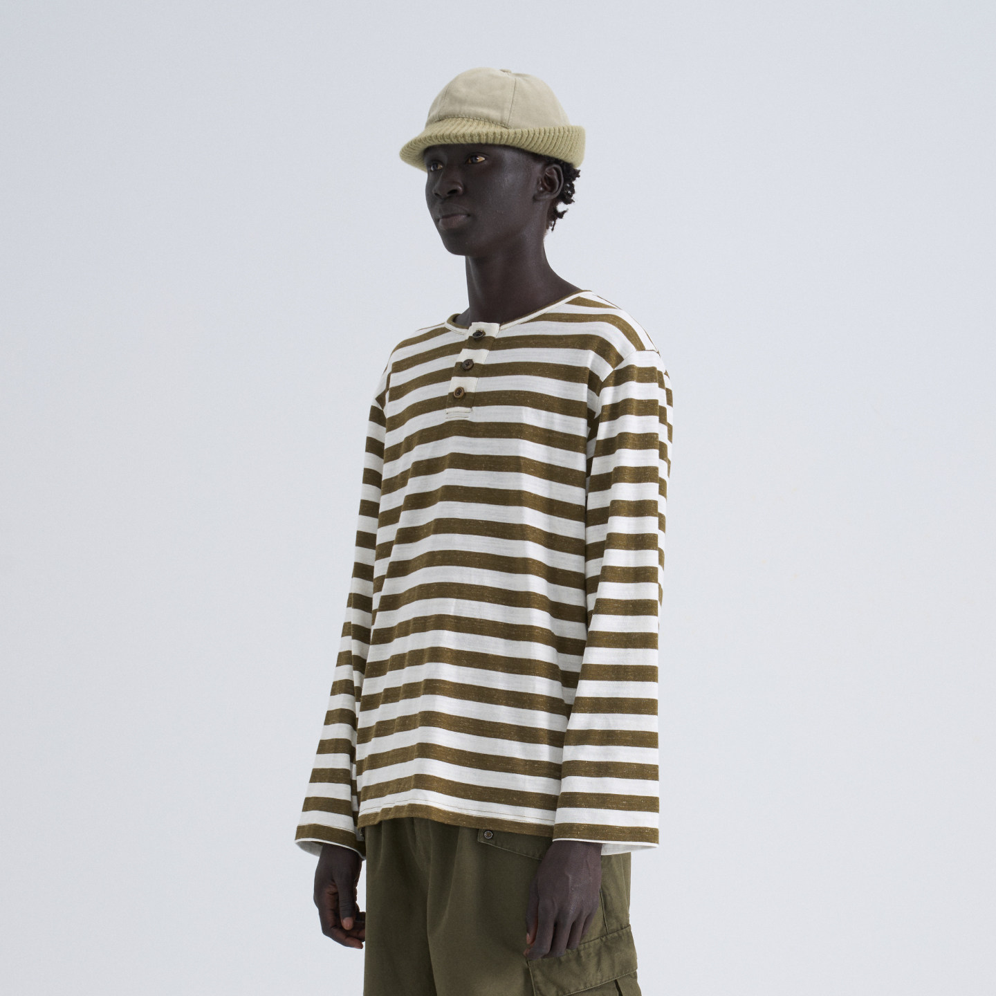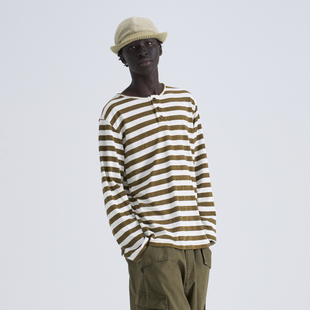 亨利领撞色拼接透气T恤百搭男女 日系复古亚麻条纹长袖 TIRES 25AW