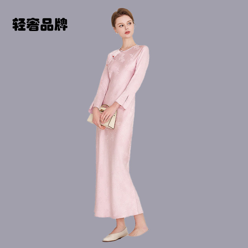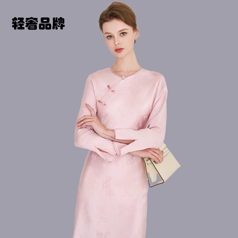 裙子 粉色提花旗袍连衣裙女2026秋中长款 朗姿约定时尚 气质新中式