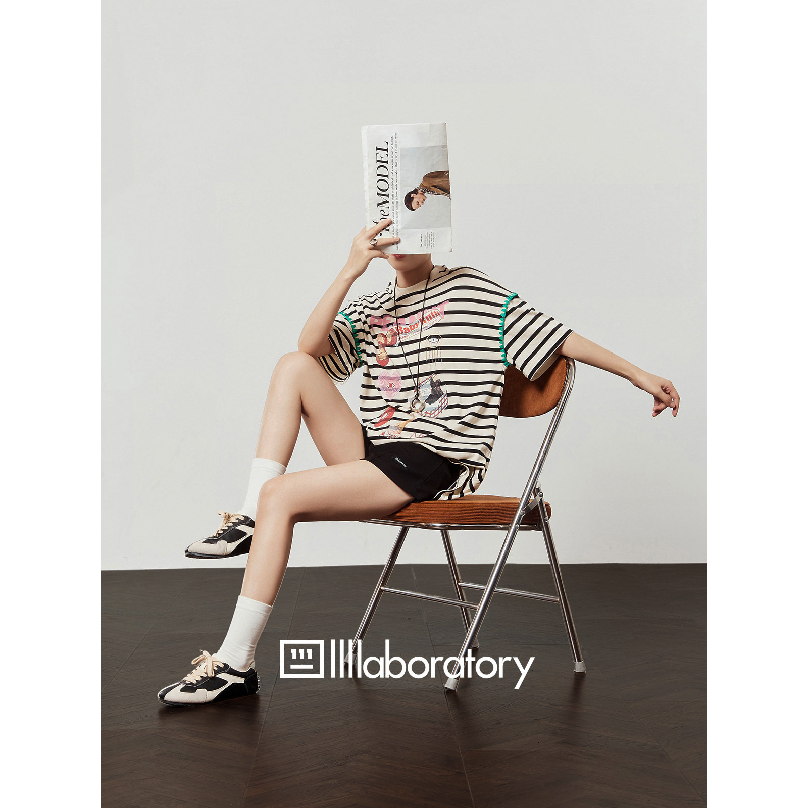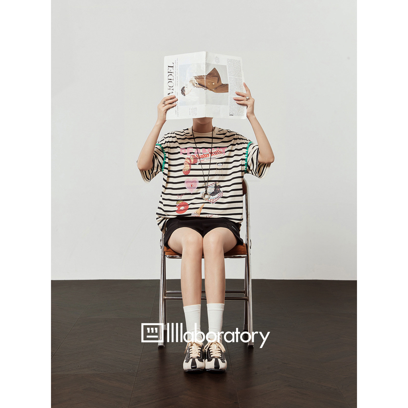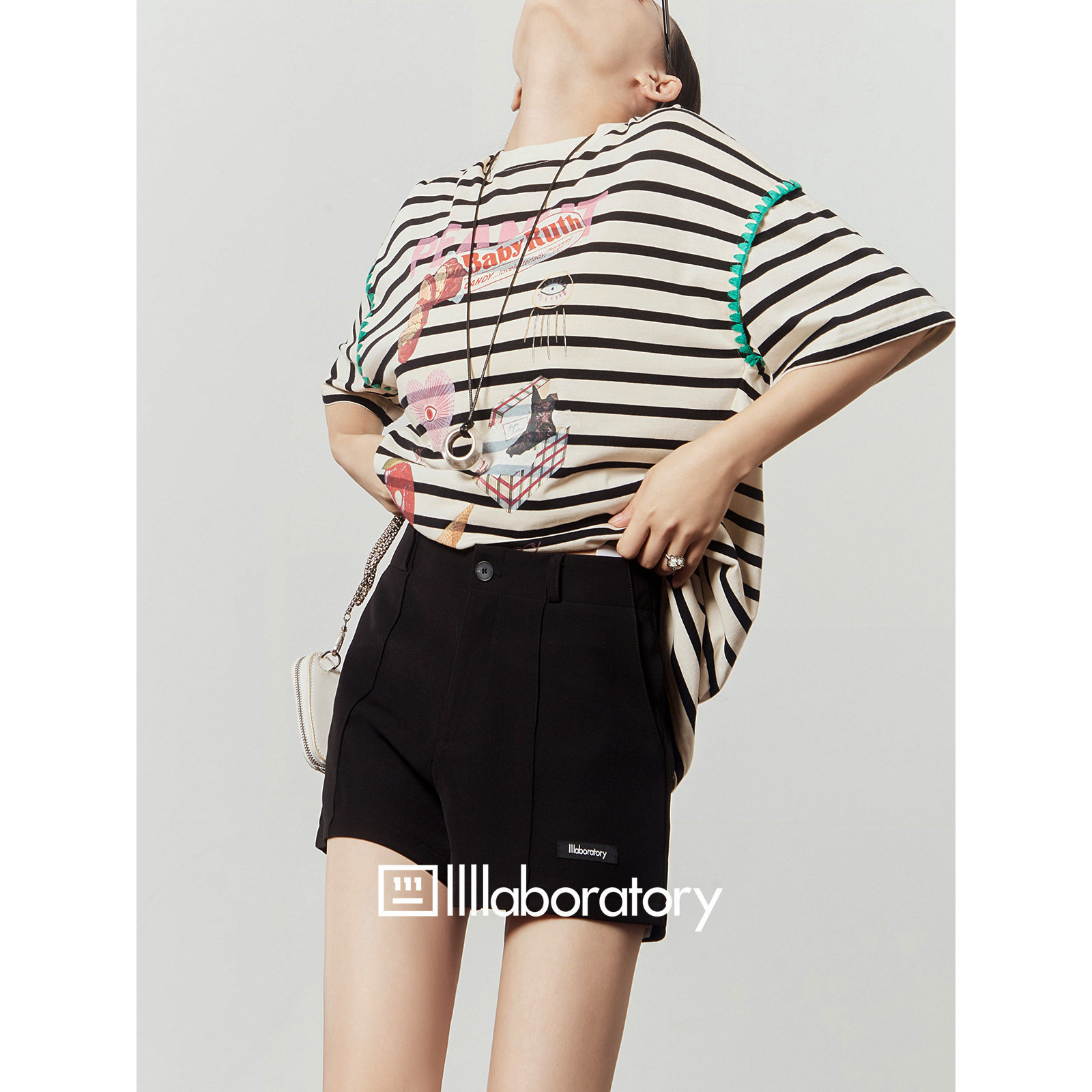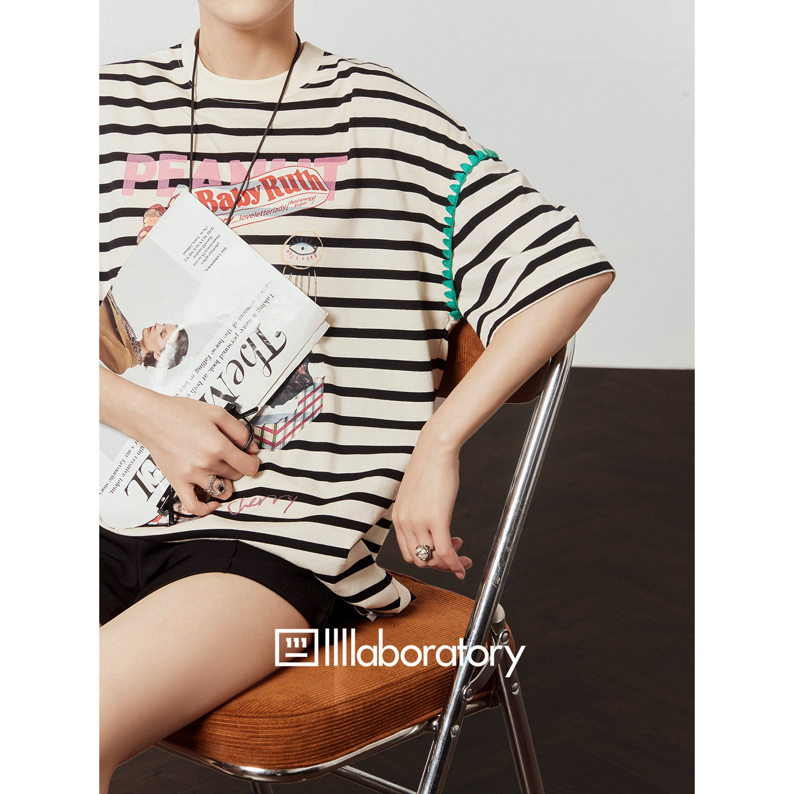 「周里物出品」白色T恤女2025夏新款 黑条纹卡通印花宽松休闲短袖