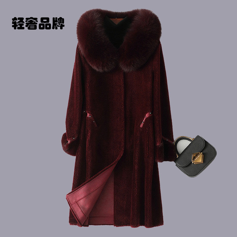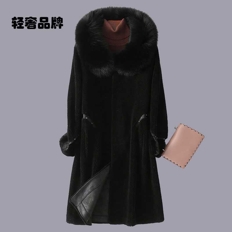 朗姿约定羊剪绒大衣女新款 2026冬狐狸毛领带帽羊毛颗粒皮草外套