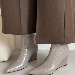 新品 坡跟真皮头层牛皮短靴女单靴灰色尖头高跟气质灰色洋气时尚